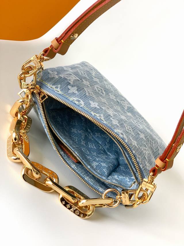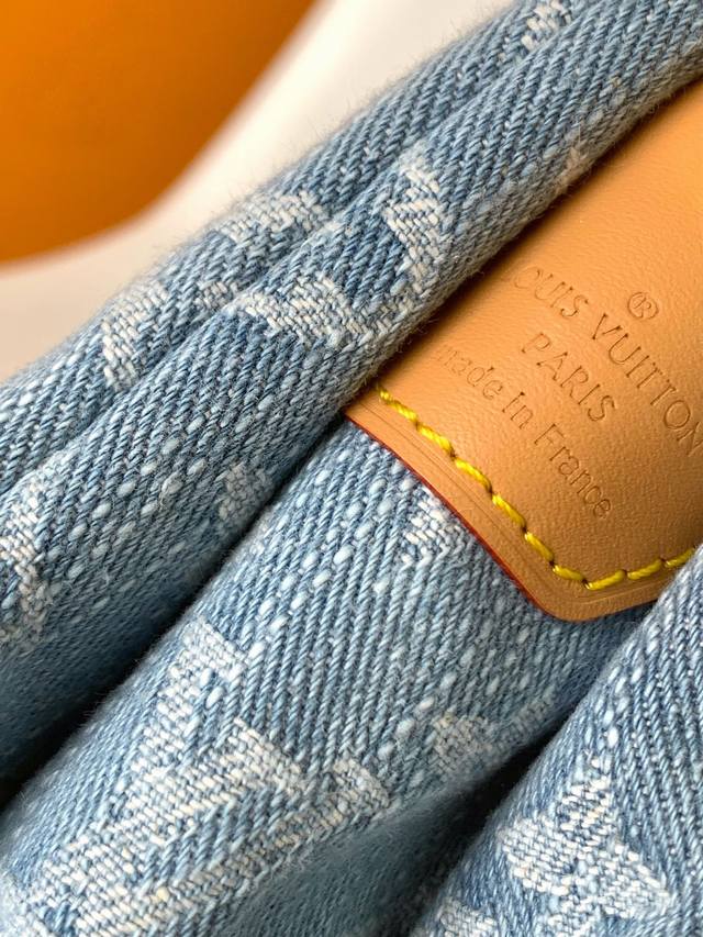 M11401 Top-quality original light blue denim Nano Speedy handbag. This Nano Speedy handbag features a Monogram pattern woven into cotton denim, bleached and sand-washed for a vintage look. Cow leather handles and a detachable, adjustable shoulder strap offer a subtly distressed finish. The Coussin Bb Monogram pattern contrasts sharply with the rugged patterned chain. A leather interior compartment provides convenient storage for evening essentials, and the detachable shoulder strap allows for multiple carrying options. Dimensions: 21 x 16 x 7 cm (Length x Height x Width)