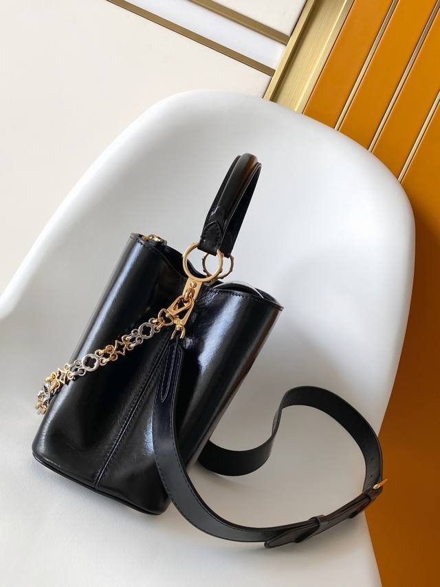 M12924 Black M12929 Light Grey M12927 Chocolate Premium Original Dynamic 163 This Capucines Souple medium handbag features glossy cowhide leather with a wrinkled effect, creating a striking visual contrast with the dazzling metal hardware. A delicate key pouch continues the signature design, while a detachable floral-patterned double-plated chain exudes gothic style. Ample space accommodates everyday essentials, and it can be carried by hand or over the shoulder. 33.0 X 24.0 X 12.0 cm (Length X Height X Width)
