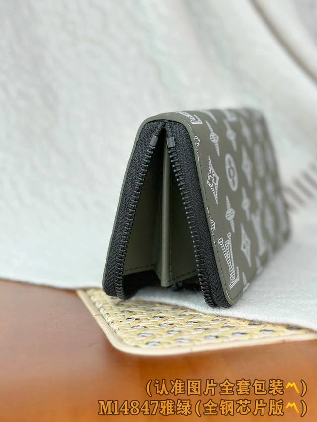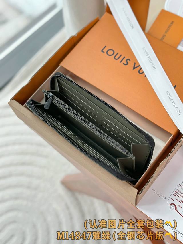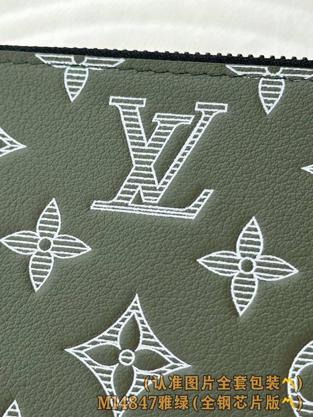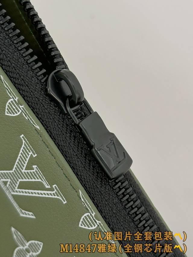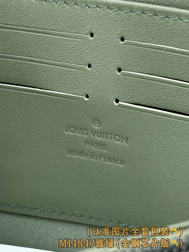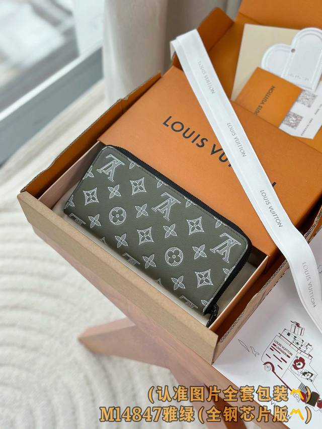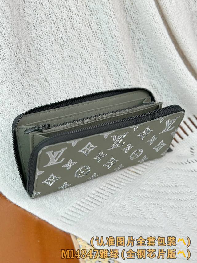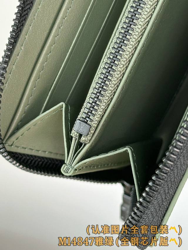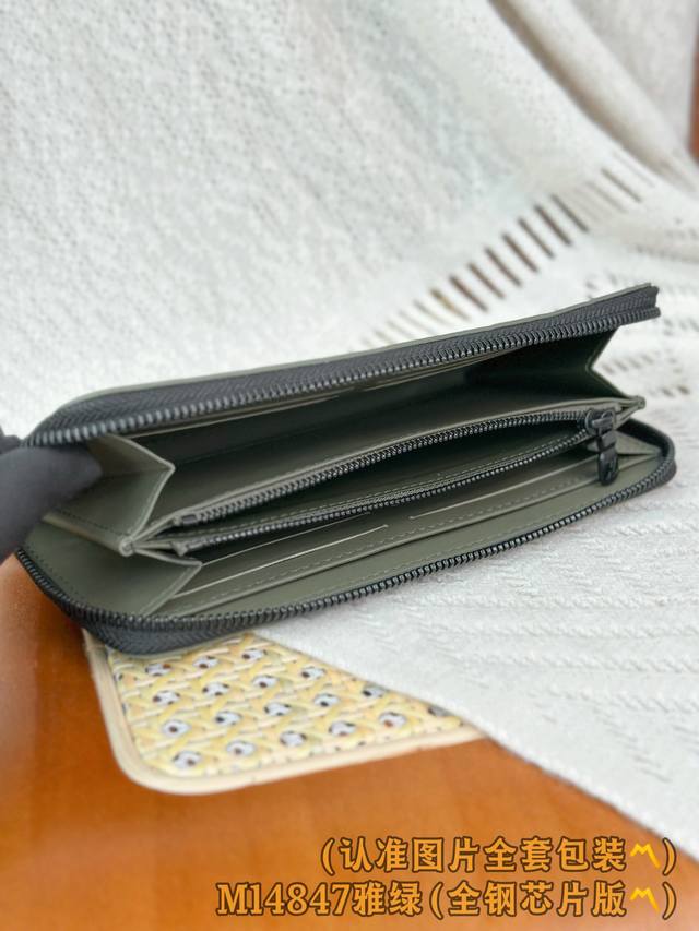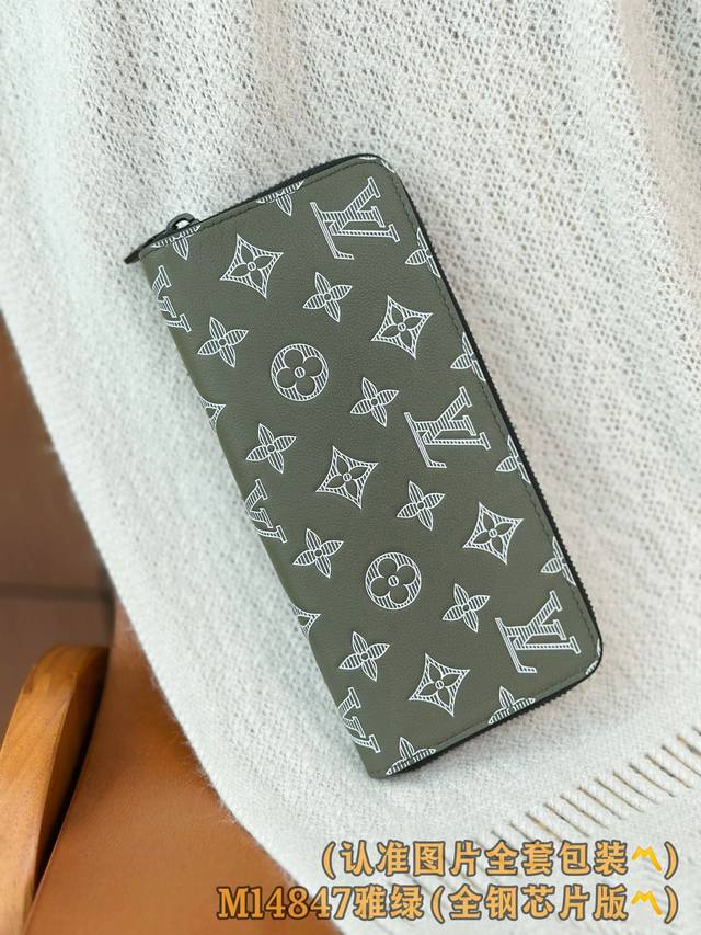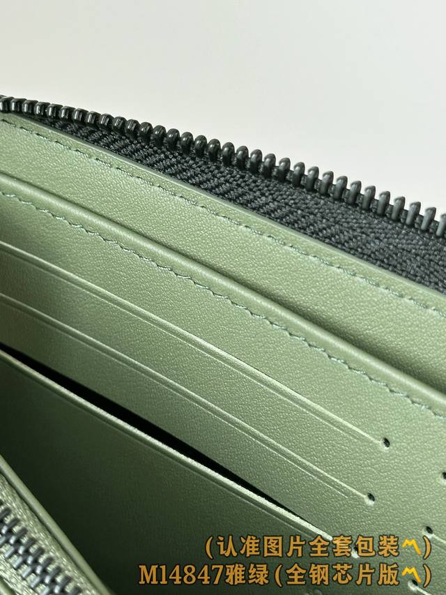 M14847 Elegant Green A-grade all-steel personalized edition! Variable code core! Horizontal zipper wallet, this horizontal zipper wallet is a long wallet with a full zipper design and is crafted from elegant Monogram Shadow embossed calfskin. The soft calfskin adds a soft and unique texture to this wallet, while the accordion-style interior includes 12 business card slots, a central zippered pocket for coins, and two additional compartments for bills, receipts, or other small papers.