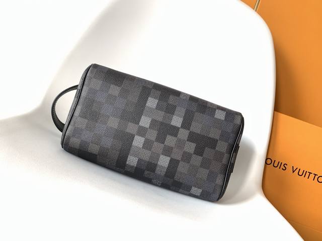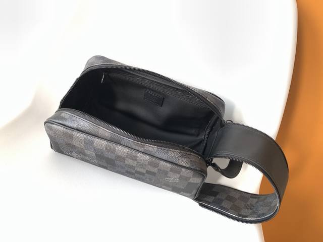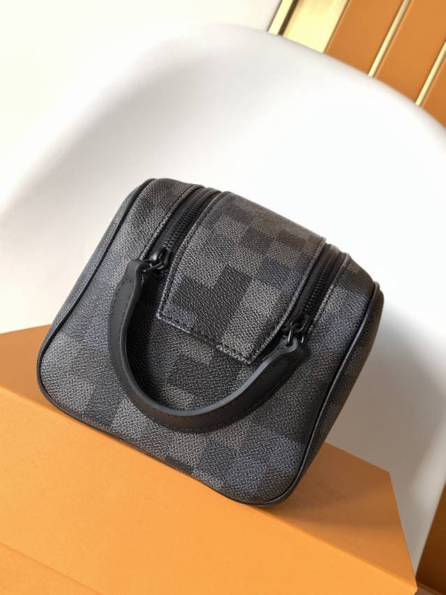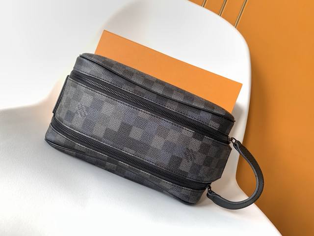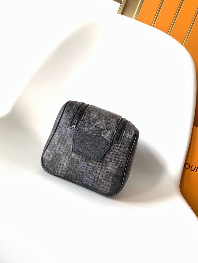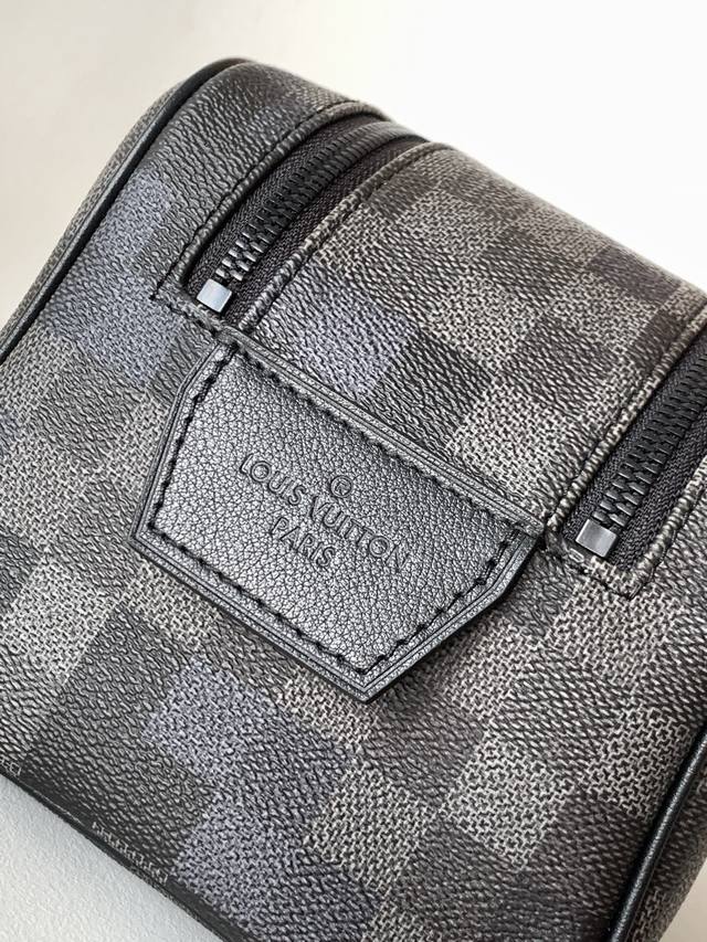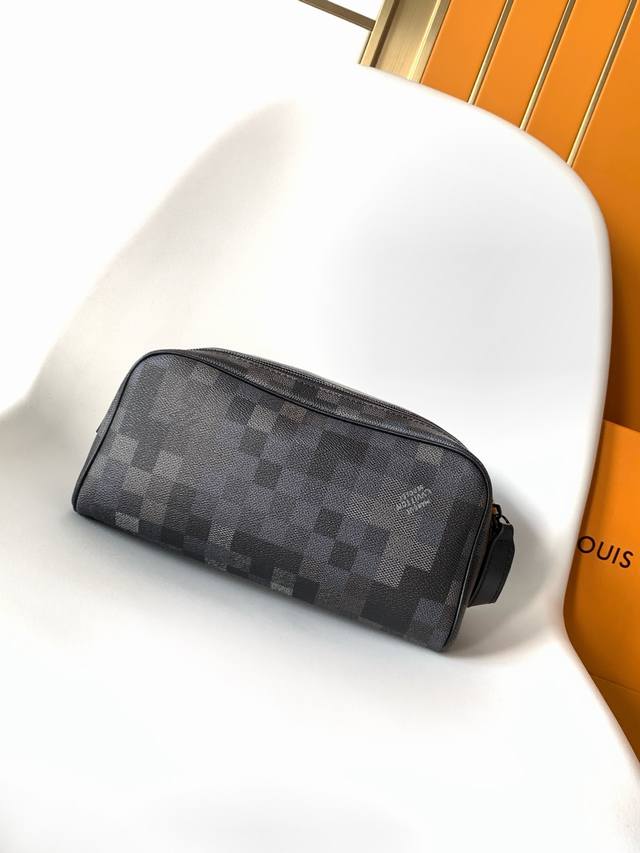 M15109 Top-tier original single dynamic 163 Ddd Damoflage Black canvas infuses this Dopp Kit with a modern feel. The design uses a black and grey color scheme, accented with black leather trim. The toiletry bag features a double zipper design and leather handles for easy access to beauty products. The interior is lined with washable textiles for added practicality, and one of the checkerboard squares is adorned with the Marque L.Vuitton D