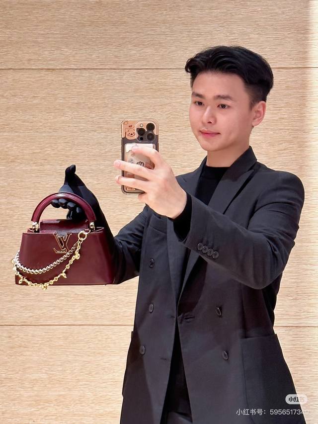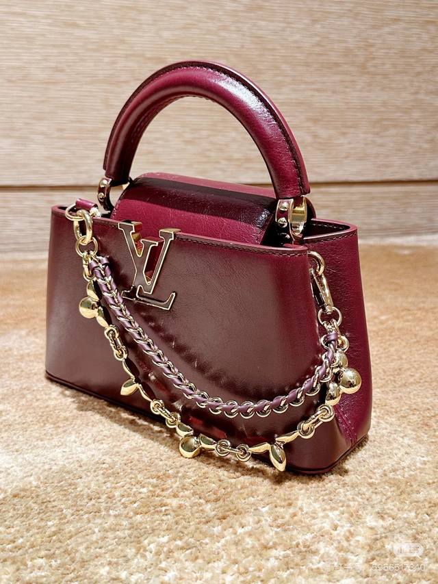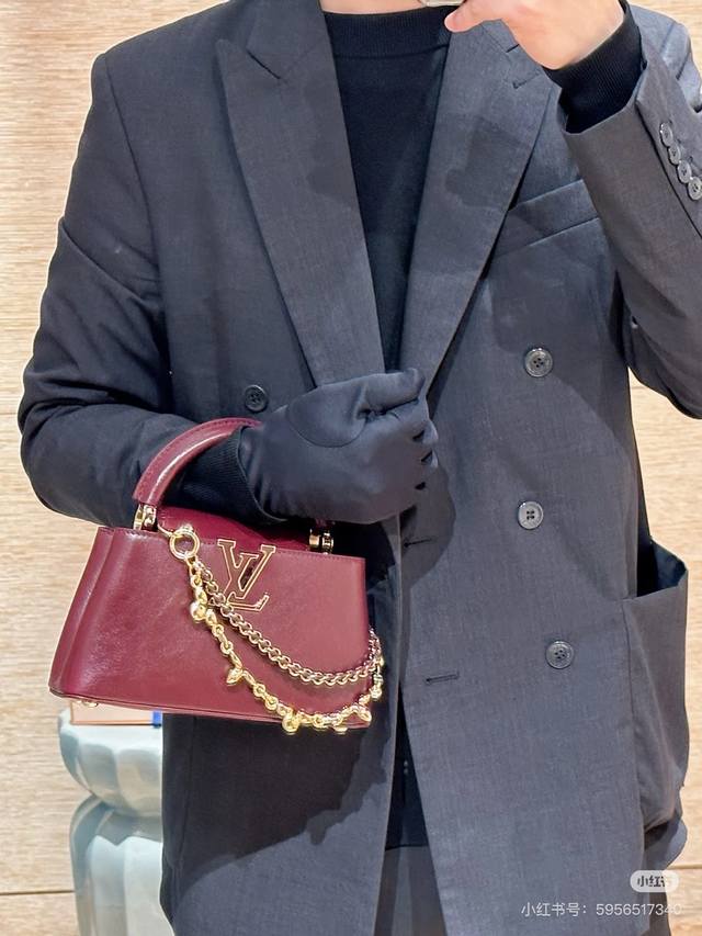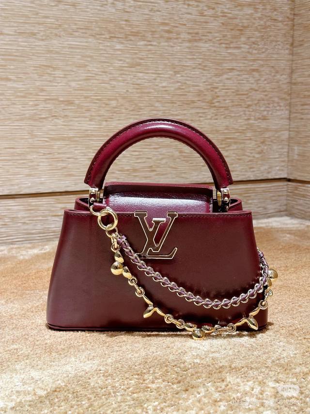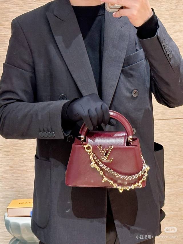 M25473 Burgundy Oil-Waxed Leather Authentic Product Image DDD Chain Full Leather Capucines East-West BB Handbag (Na Ying Style) DDD