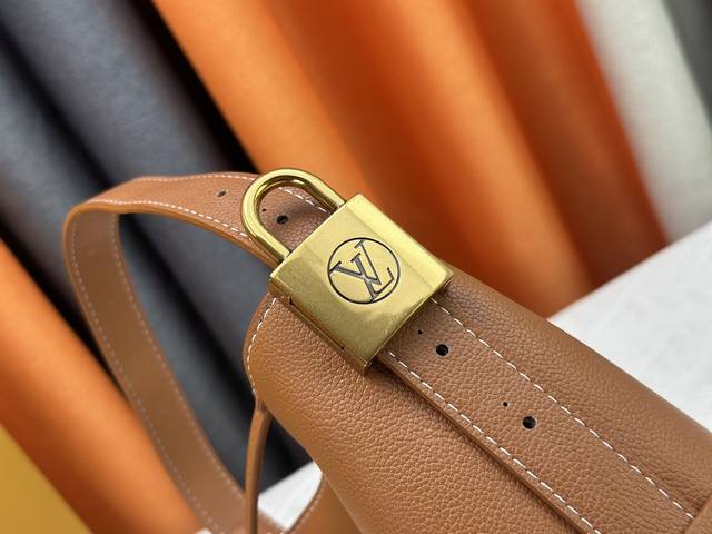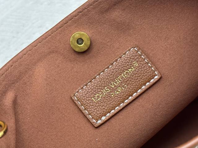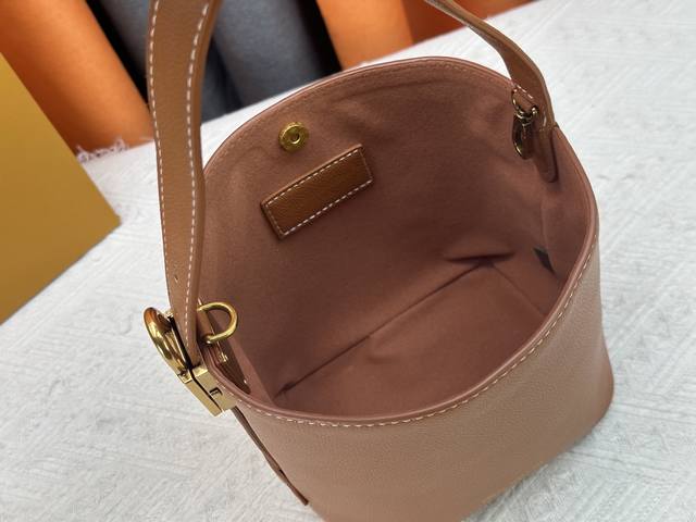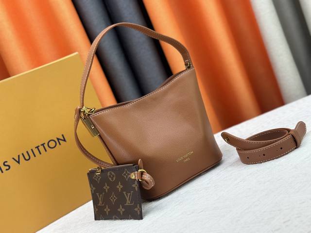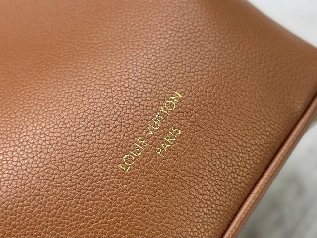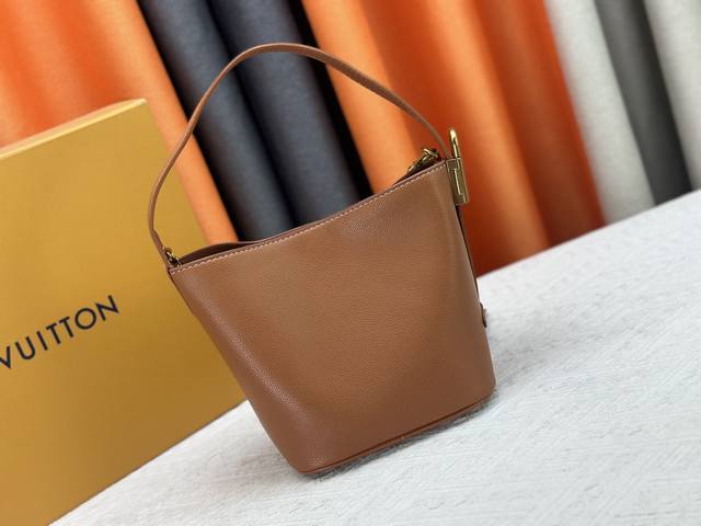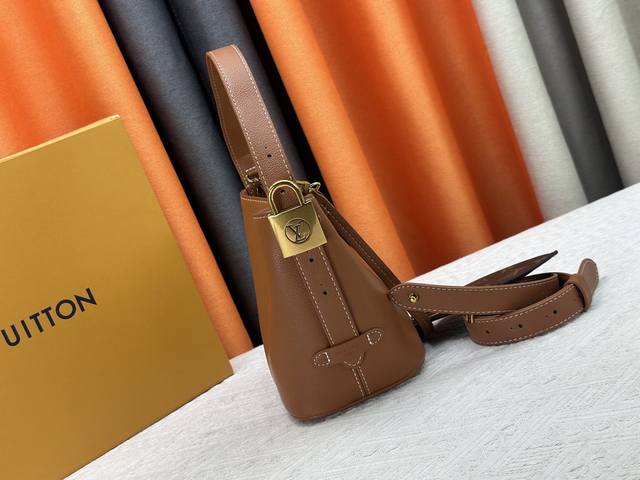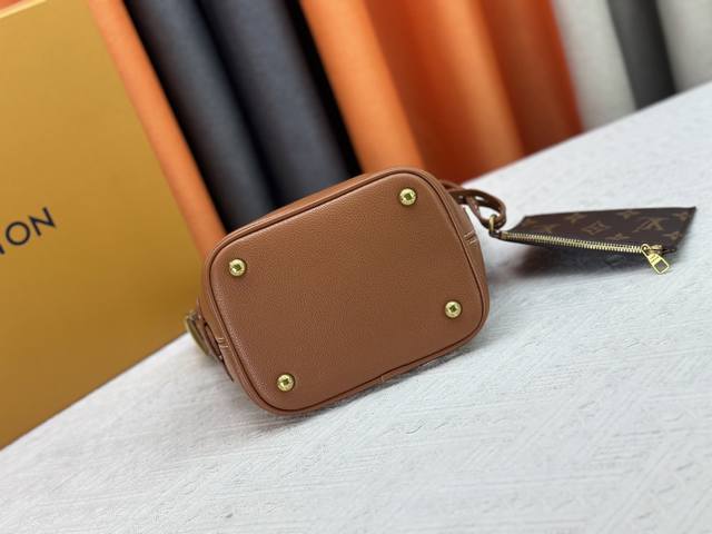 This All In Bb bag, from the Low Key collection, is crafted from grained cowhide leather into a compact bucket bag shape, allowing for versatile day-to-night carry options. Distressed hardware conveys a vintage feel, while the padlock and removable Monogram pocket highlight the brand's signature style.