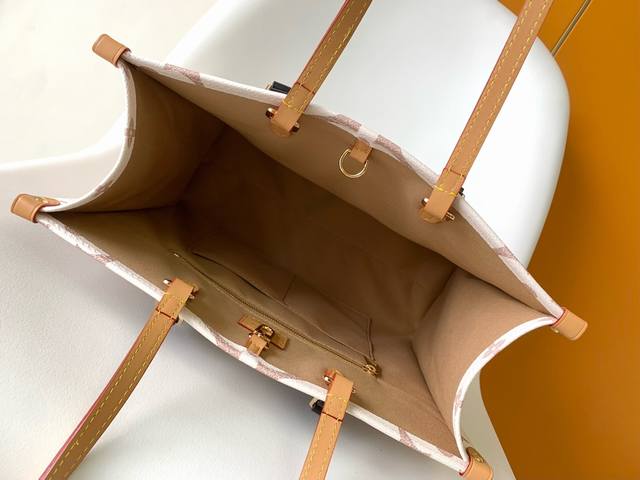 M46912 Premium Original Dynamic Chip. This Onthego medium tote features a Monogram pattern, first dyed and then embossed onto soft grained cowhide. It features a large floral silk-screen print on a color combination of white, black, and yellow leather. The spacious interior accommodates a laptop and other office supplies, and the long and short handles facilitate hand or shoulder carry. Dimensions: 34.0 x 26.0 x 13.0 cm. 110% J465560