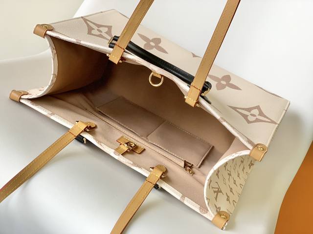 M46912 Top-quality original Onthego medium tote bag. The Monogram pattern is first printed and then embossed onto soft grained cowhide. It's a two-tone color-blocked diaper bag with large floral print in white, black, and yellow leather. Its spacious interior can hold a laptop and other office supplies. The various handles allow for easy hand-carrying or shoulder carrying. Dimensions: 34.0 x 26.0 x 13.0 cm. 110% J465560 DDD