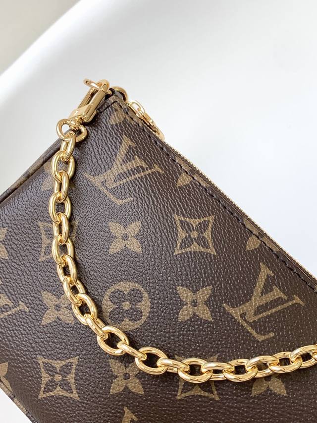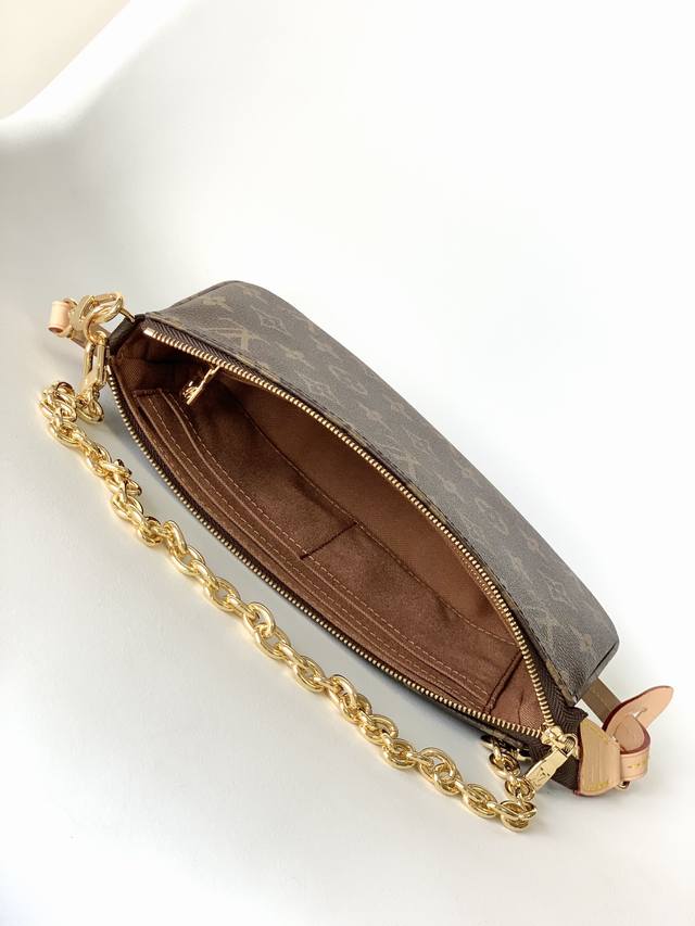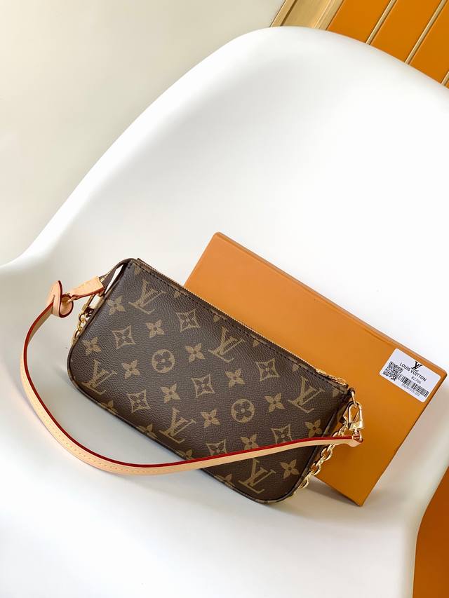 M82766 Top-tier original Pochette Accessoires handbag. This classic design is presented in Monogram canvas, featuring a zippered opening and ample interior space. It includes a zippered pocket, slip pocket, and card slot for securely storing everyday essentials. The leather shoulder strap and chain are detachable, allowing for multiple carrying options. Dimensions: 23.5 x 13.5 x 4.0 cm (Length x Height x Width).