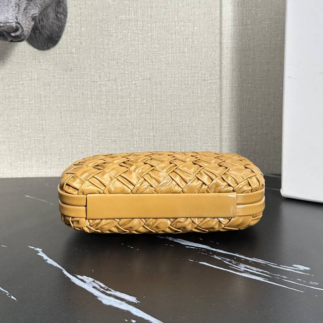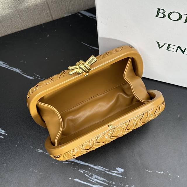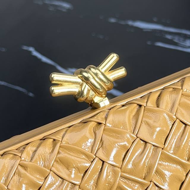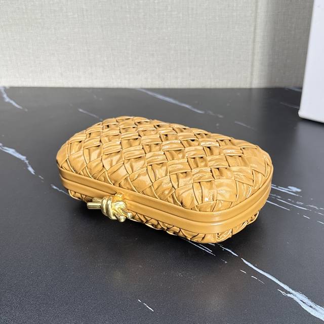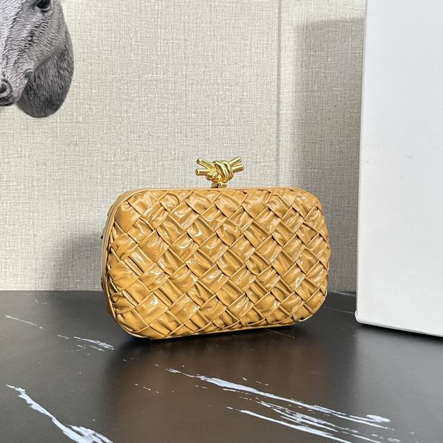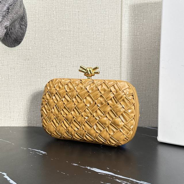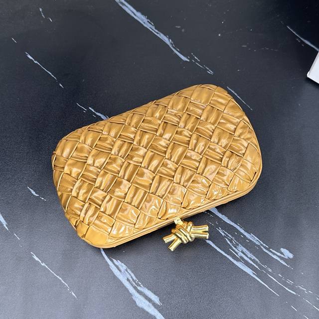Model: 6056 Bv's evergreen classic clutch makes a grand return in a wrinkled wood finish. Bv's renowned The Knot clutch, with its signature woven texture and knotted clasp, exudes elegance and refinement, making it a favorite among Hollywood stars and socialites, who often pair it with their gowns for formal occasions. The Knot's compact and refined design, understated without logos or cumbersome floral embellishments, creates a simple yet elegant look that imbues a woman with a graceful and graceful presence. While seemingly as simple as weaving a flower basket, the craftsmanship of Bv's artisans is the product of years of accumulated experience. The weave features this season's Foulard intreccio leather design. The new Muse brass twisted metal design offers a more minimalist aesthetic, adding a modern and sophisticated touch. The Knot showcases the exceptional craftsmanship and creativity of the intreccio weave pattern, its contours reinterpreting a traditional classic. This collectible classic gets its name from its button-closure design. Special weaving + metal frame combination