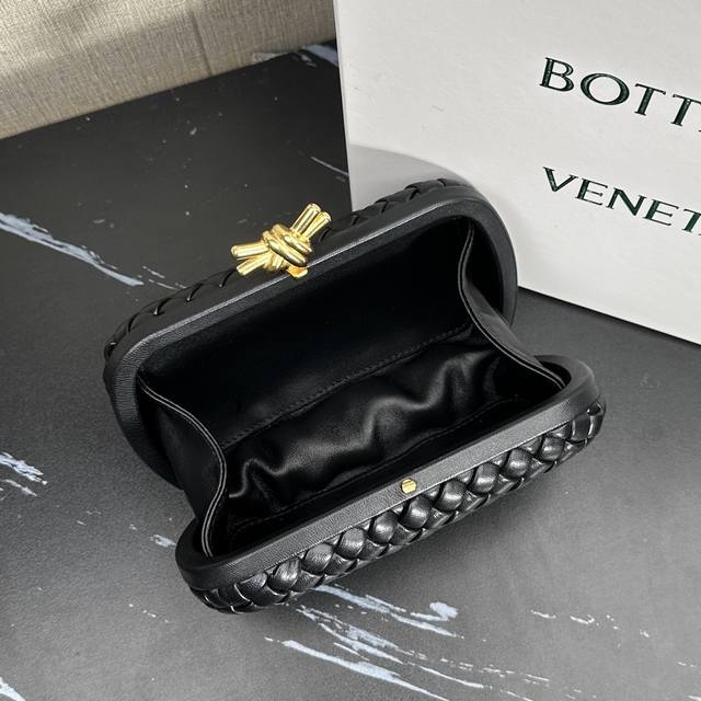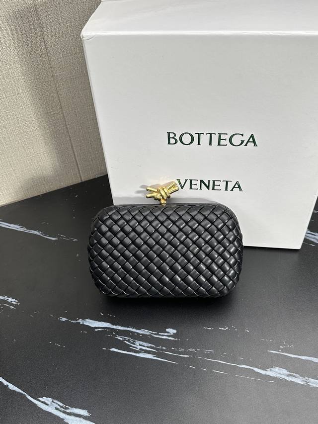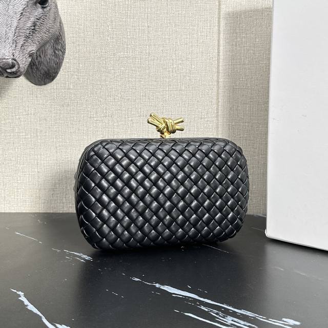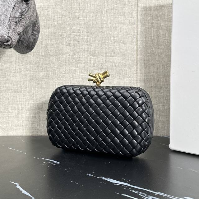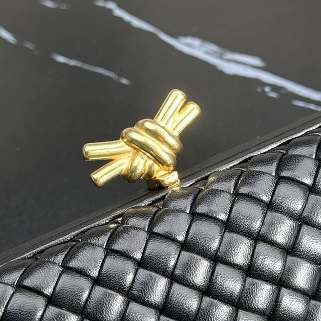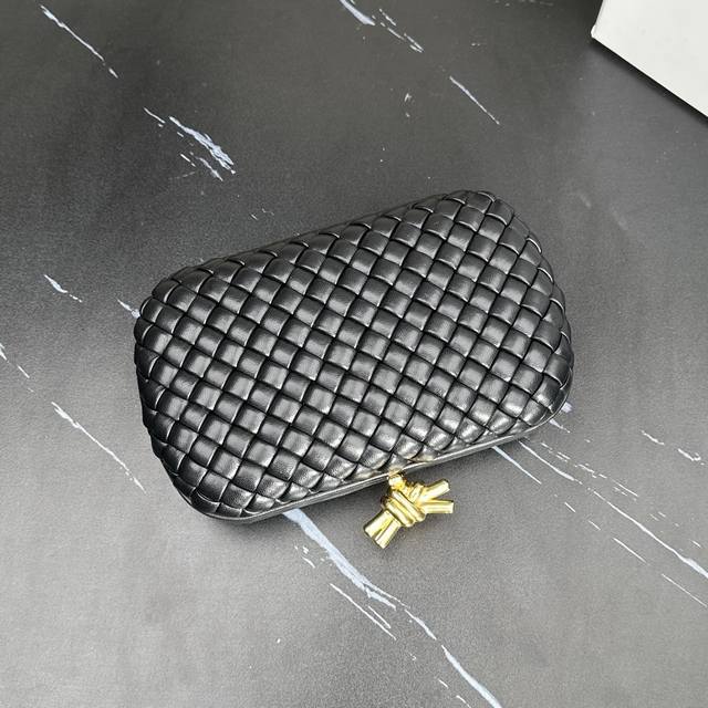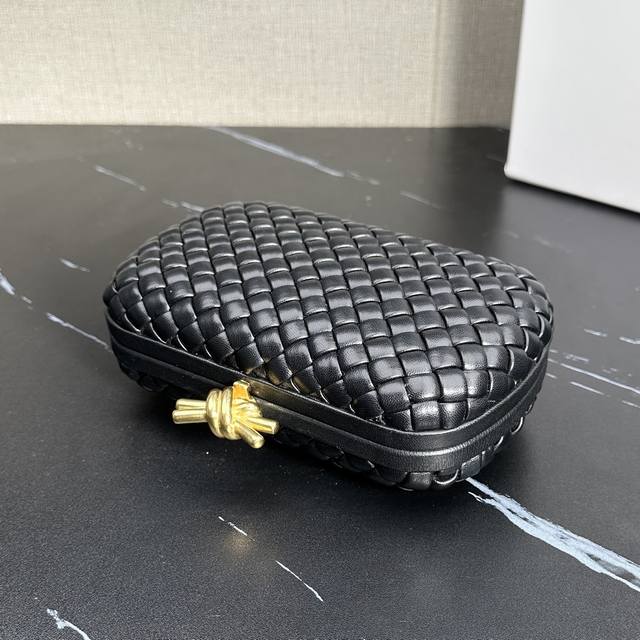 Model: 6056 Bv's evergreen classic clutch returns in black. Bv's renowned The Knot clutch, with its signature woven texture and knotted clasp, exudes elegance and refinement, making it a favorite among Hollywood stars and socialites, who often pair it with their gowns for formal occasions. The Knot's compact and refined design, understated without logos or cumbersome floral embellishments, creates a simple yet elegant look that imbues a woman with a graceful and graceful presence. While seemingly as simple as weaving a flower basket, the craftsmanship of Bv's artisans is the product of years of accumulated experience. The weave features this season's Foulard intreccio leather design. The new Muse brass twisted metal offers a more minimalist aesthetic, adding a modern and sophisticated touch. The Knot showcases the exceptional craftsmanship and creativity of the intreccio weave pattern, its contours reinterpreting a traditional classic. This collectible classic gets its name from its button-closure design. Special weaving + metal frame combination