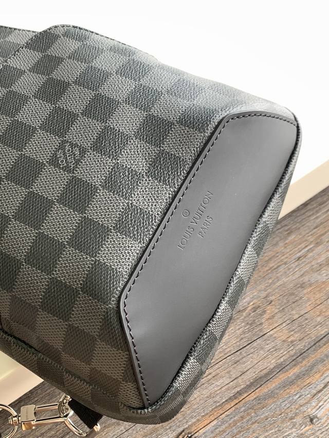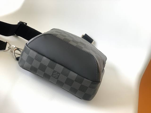 N40008 Black Graphite Chest Bag Series Avenue Shoulder Bag. This Damier Graphite canvas shoulder bag is the perfect companion for urban life: compact and stylish, showcasing a casual yet carefree attitude. The "smart" shoulder strap design allows for carrying on either the left or right shoulder. The design improves carrying comfort; the double zipper closure ensures your valuables are securely stored. Dimensions: 20 x 31 x 10 cm.