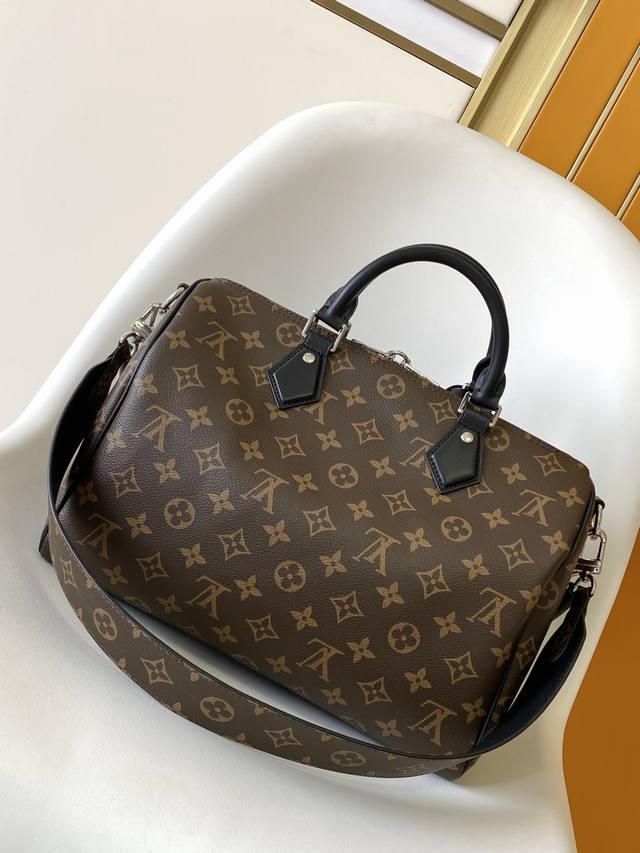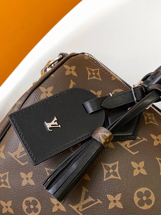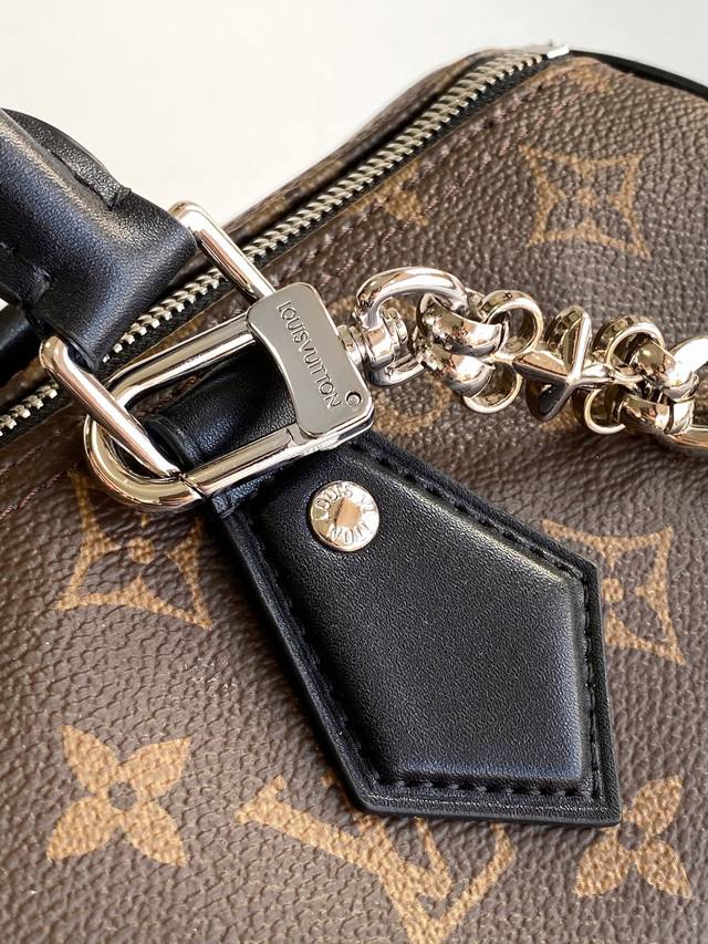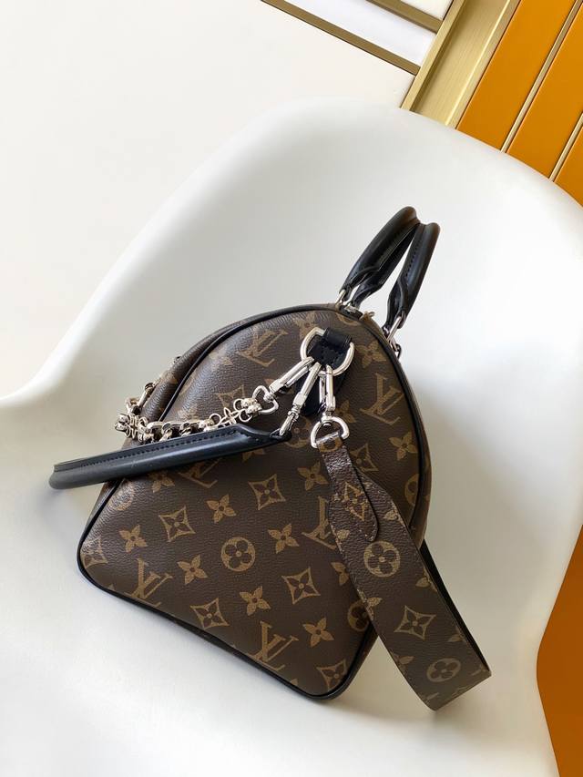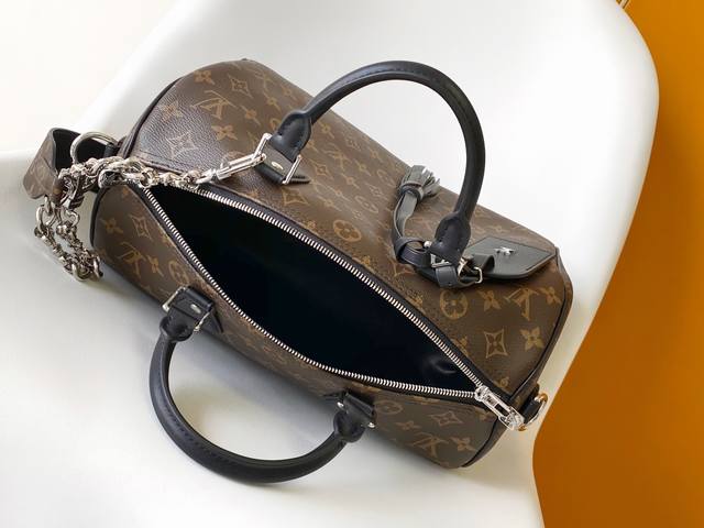 The Speedy Soft 30 Boho handbag, a premium original in black with dynamic resizing, is crafted from classic Monogram coated canvas, accented by a leather lining and zippered interior pocket. Ostrich leather trim and a beaded chain create a visual focal point, while a key holder and address tag create ingenious details. The Toron handle allows for versatile carrying options. 30.0 x 21.0 x 17.0 cm (L x H x W)