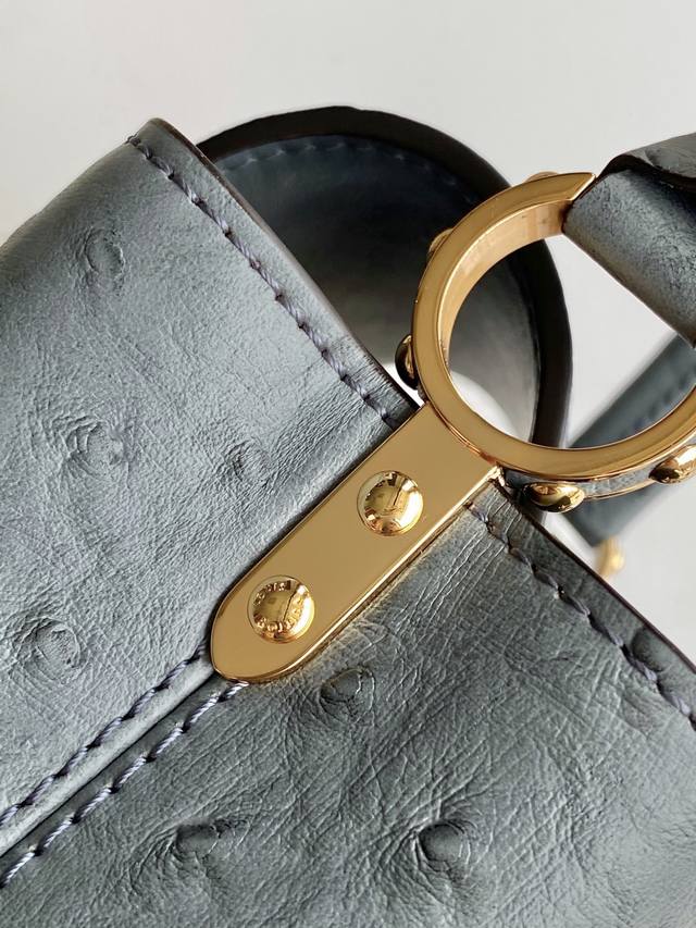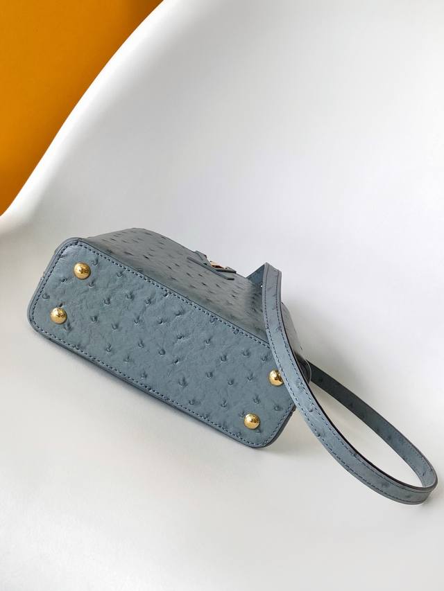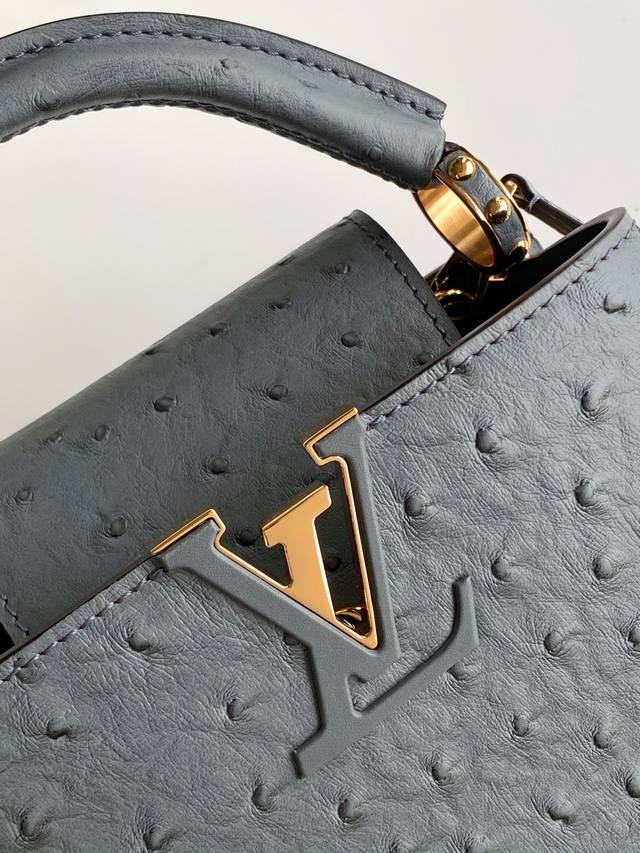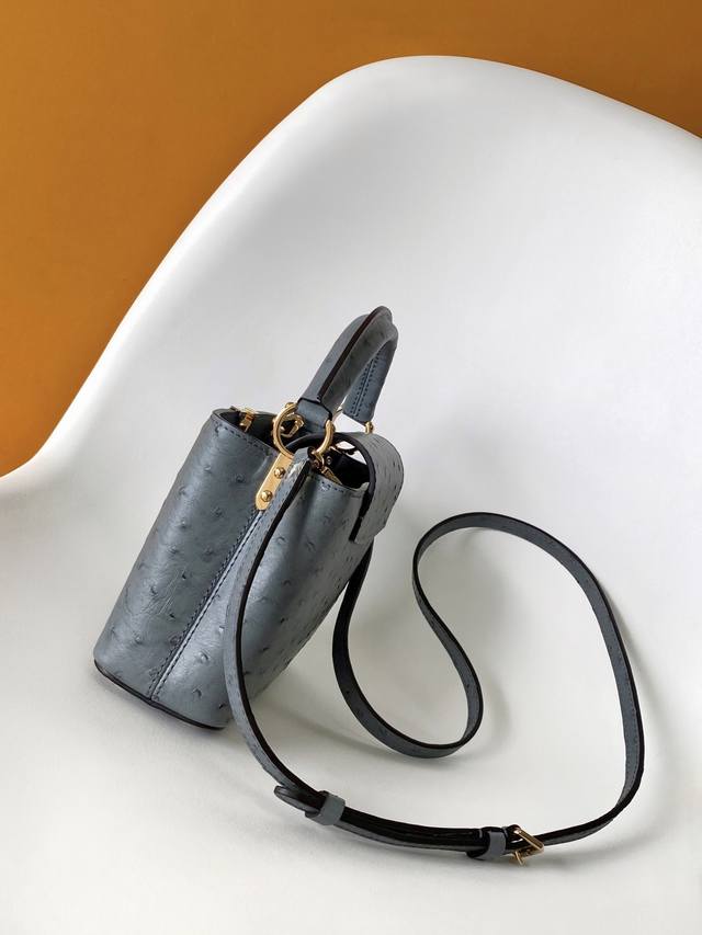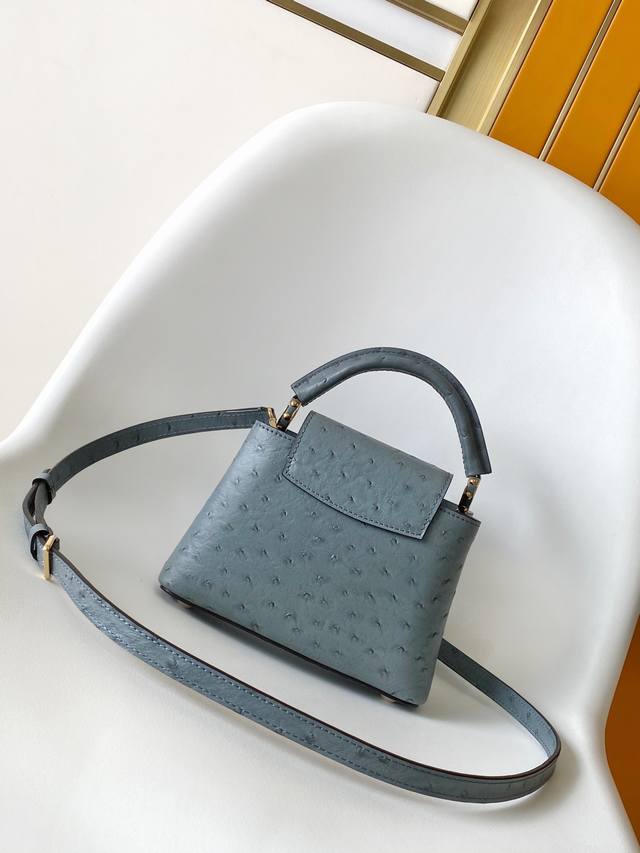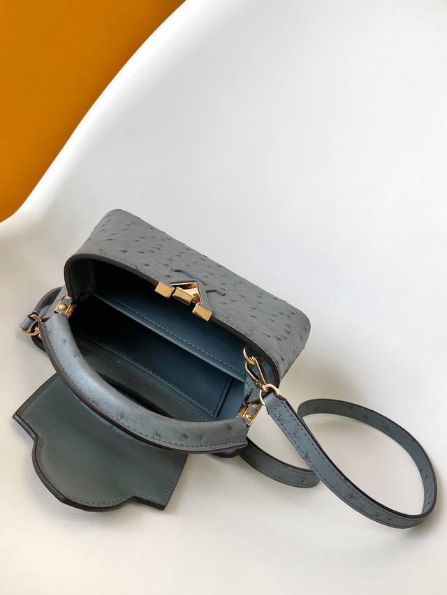 N87312 Ostrich-patterned premium original leather with dynamic chip. This Capucines BB handbag is from the Trilogy collection, conveying elegance with Taurillon ostrich leather and dazzling metal hardware. A beautiful chain adorned with a mini padlock and enamel Monogram flowers, along with multiple pockets accessible via an external or internal flap, offers sophisticated design for versatile carrying options. Dimensions: 21.0 x 13.6 x 8.0 cm (Length x Height x Width).