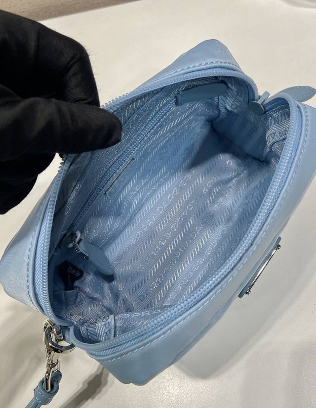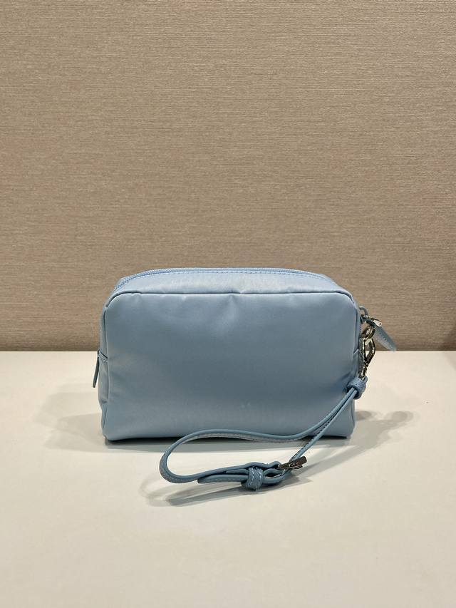 . This clutch is crafted from innovative imported Re-Nylon recycled nylon fabric. The signature enameled metal triangle logo accentuates the clean lines. Opening the bag reveals an interior zippered pocket. A detachable leather wristlet provides ample storage for everyday essentials. The large clutch you've been dreaming of has arrived! Hurry and grab yours! 9