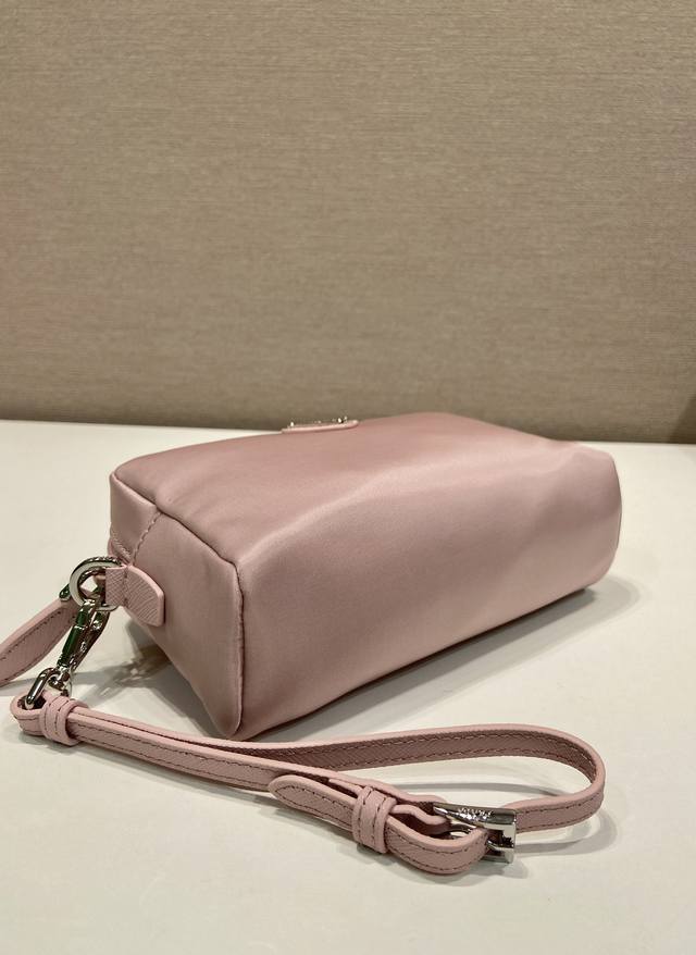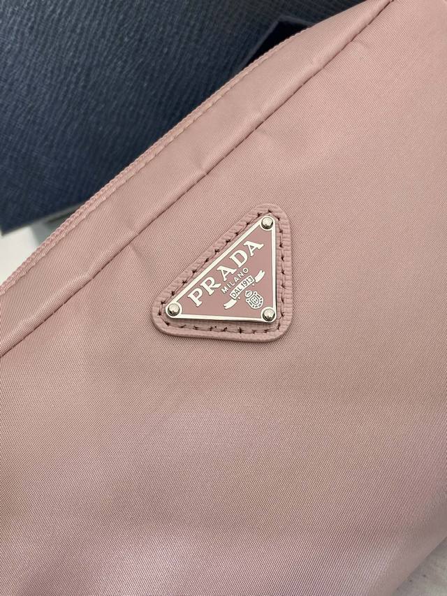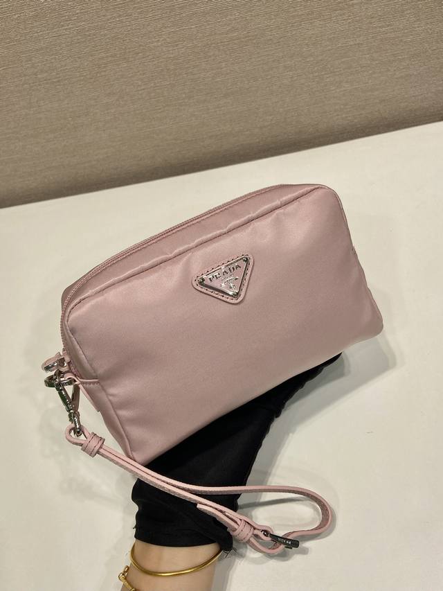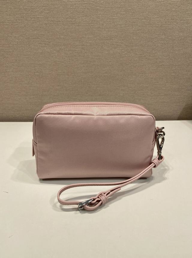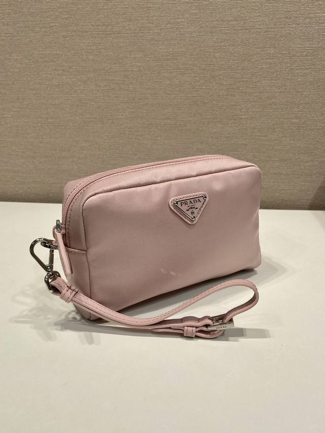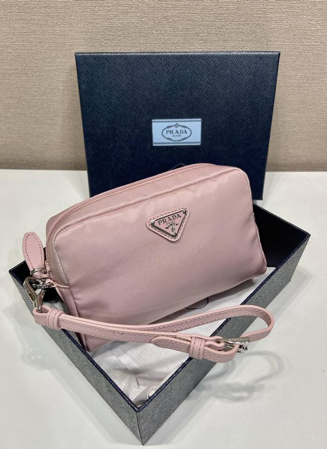 This clutch is crafted from innovative imported Re-Nylon recycled nylon fabric. The signature enameled metal triangle logo accentuates the clean lines. Opening the bag reveals an interior zippered pocket. The removable leather wristlet offers ample storage for everyday essentials. The large clutch you've been dreaming of has arrived! Hurry and get yours!