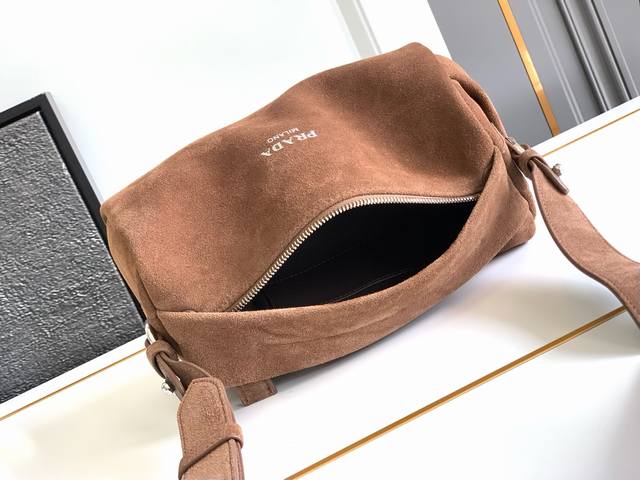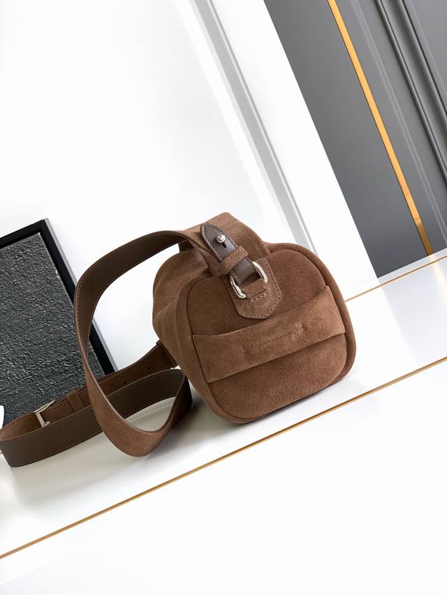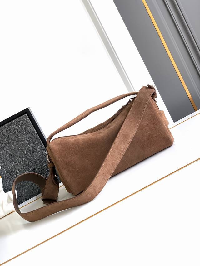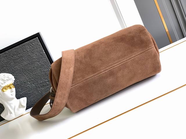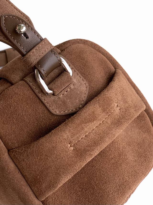 New Boston Suede Handbag. This stylish and compact Boston handbag draws inspiration from retro designs and details. The suede features an aged effect, giving it a soft and unique look, further accented with a metal letter logo. It comes with a detachable long shoulder strap, offers ample storage space, and is lightweight and practical. Grab one now! Model: 2Vh188 Size: 24X11X11Cm