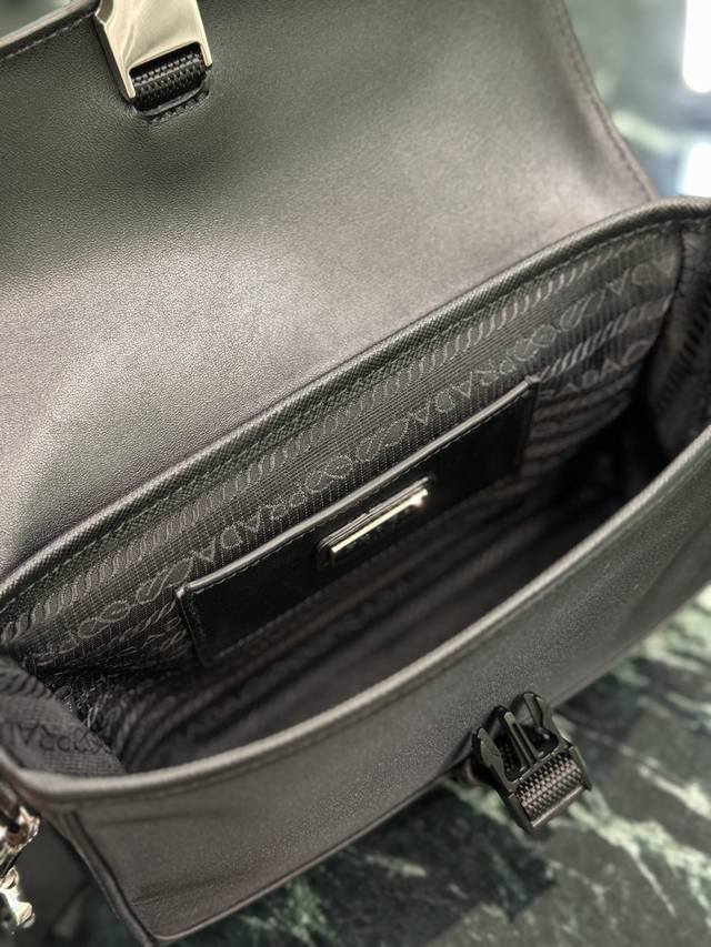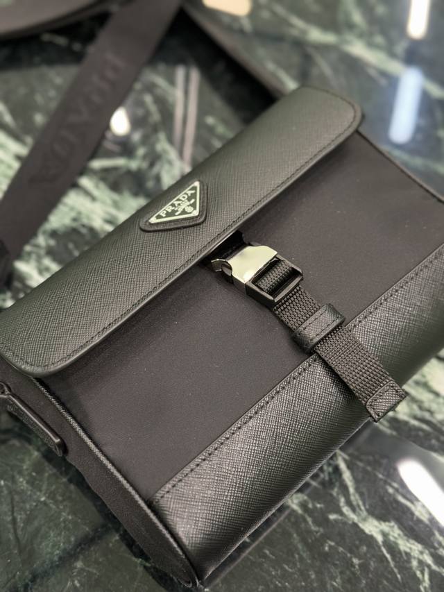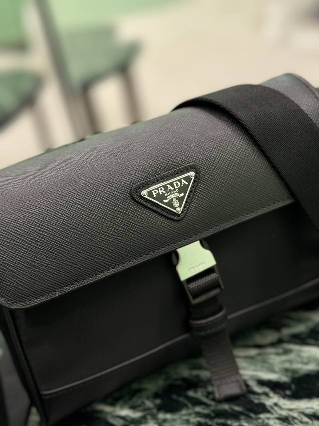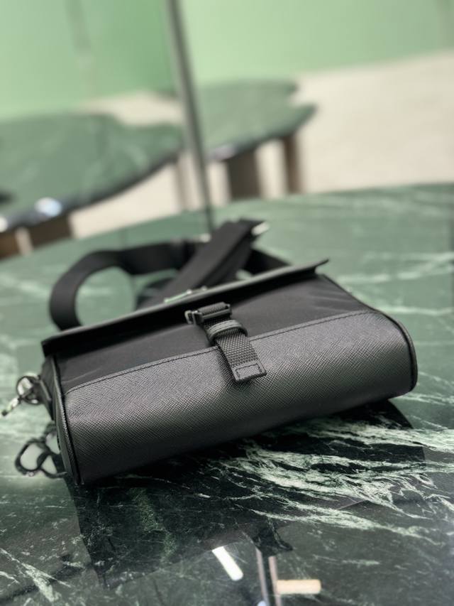 New Messenger Bag DDD This shoulder bag is crafted from Re-Nylon recycled nylon and adorned with leather details, showcasing a modern mix of materials. The recycled nylon yarn, Econyl, is made from recycled ocean plastics, fishing nets, and textile fibers. The bag is decorated with an enamel-coated triangular metal logo, a signature element from the brand's history, creating a distinctive design. DDD Dimensions: Length 20cm, Height 15.5cm x Base 4cm DDD Style Code: 2Vd044 DDD