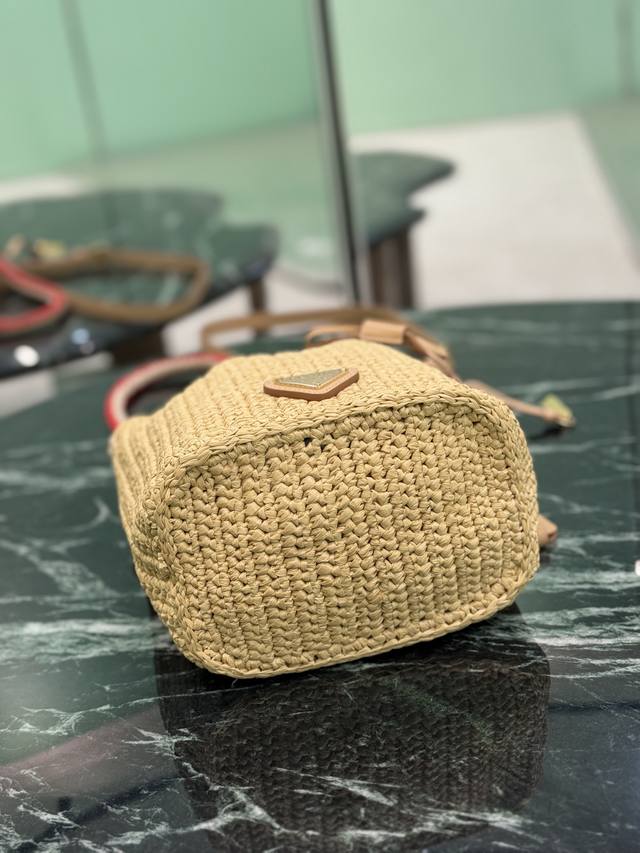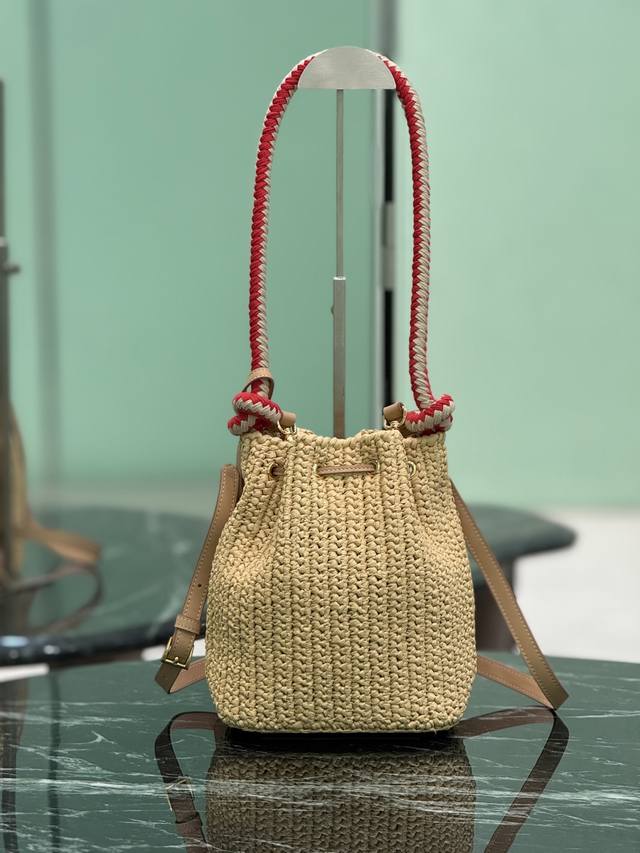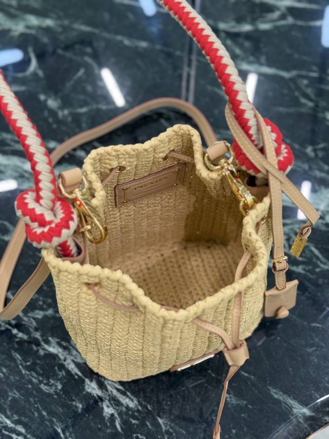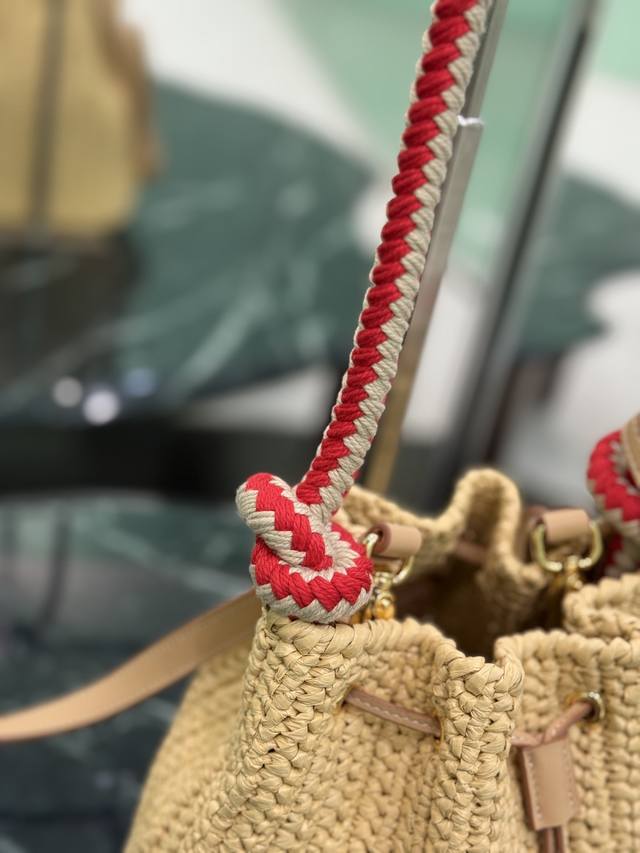 Red and white cotton rope handles, awakening the strong summer style. This pure hand-woven bucket bag is so great, with two long and short shoulder straps that can be used alternately, drawstring opening and closing, complex handwork looks particularly stylish, and has a large capacity.