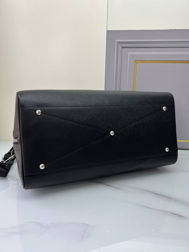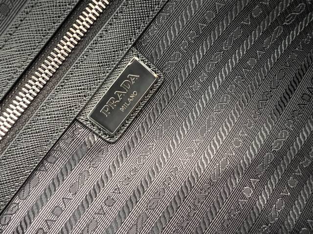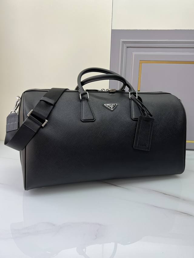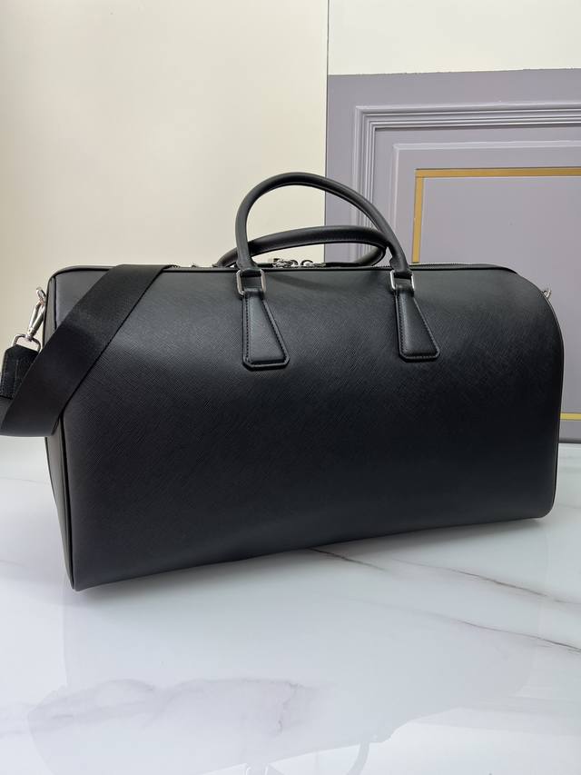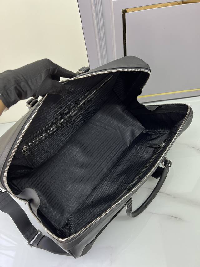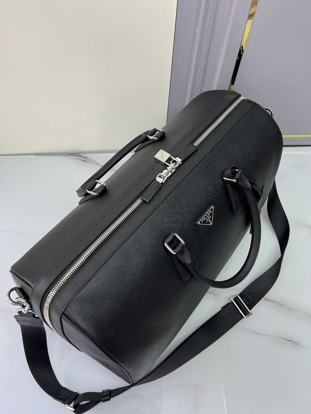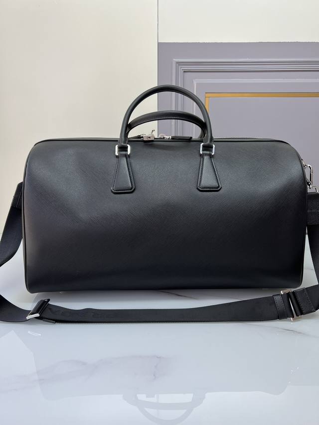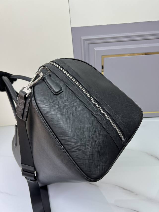 This elegant travel bag is crafted from Saffiano leather and features a wraparound zipper and nylon shoulder strap, showcasing a meticulous design philosophy. It is adorned with a leather nameplate and a metal clasp with an engraved logo, exuding dazzling charm. Simple and sophisticated. Grab yours now
