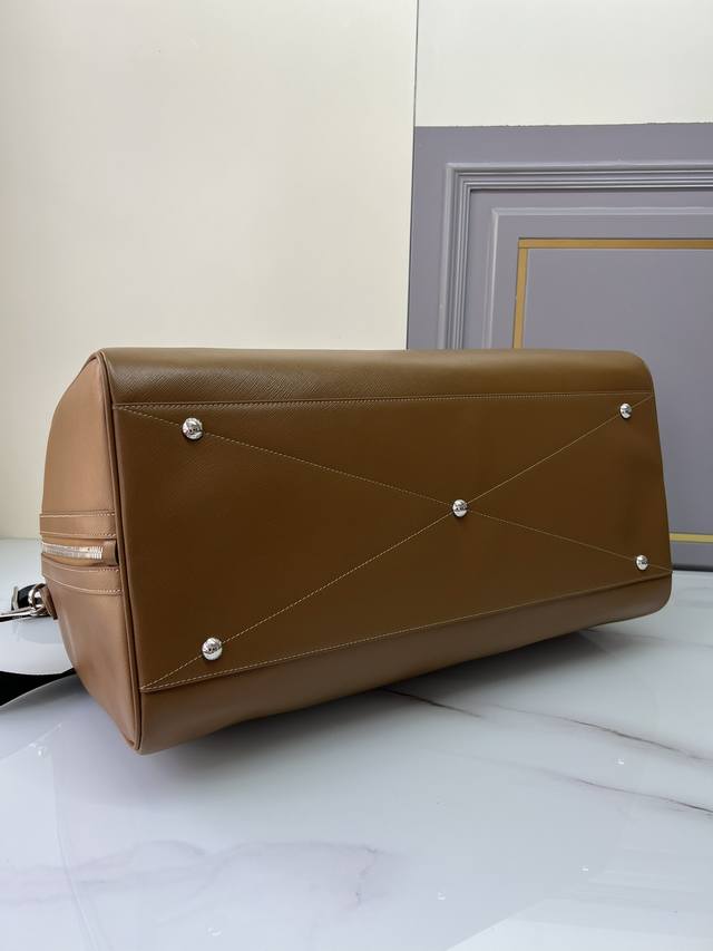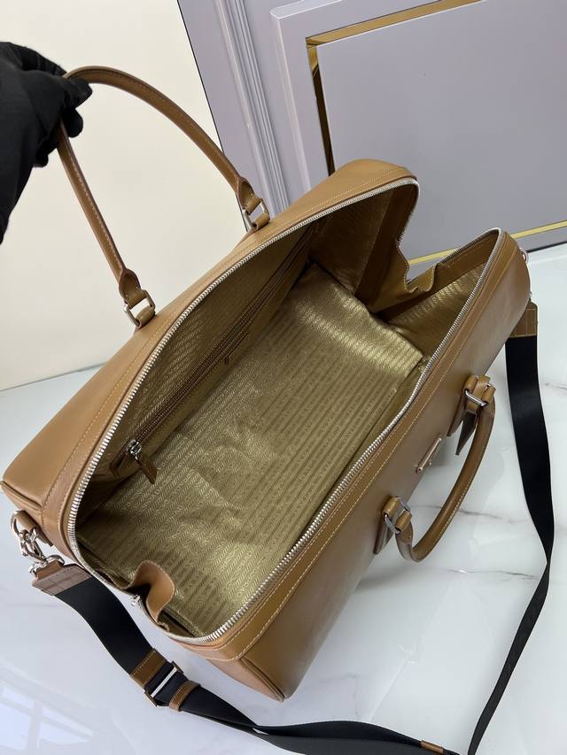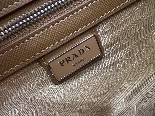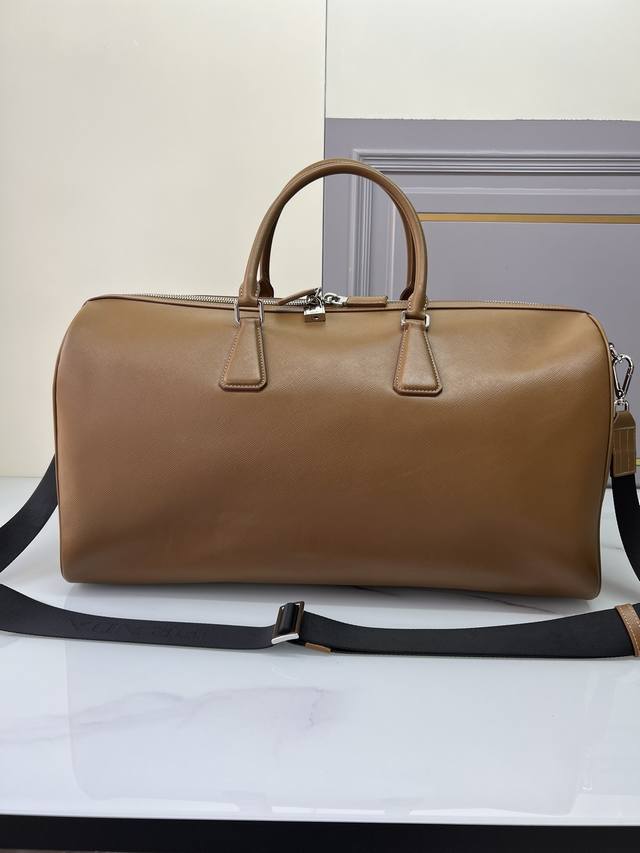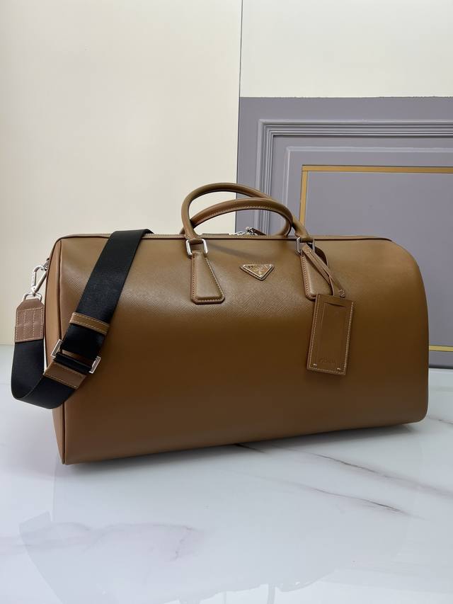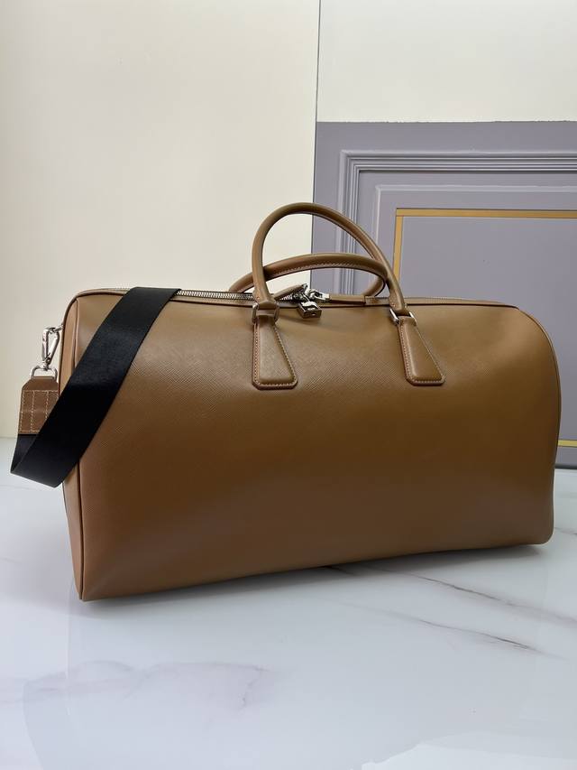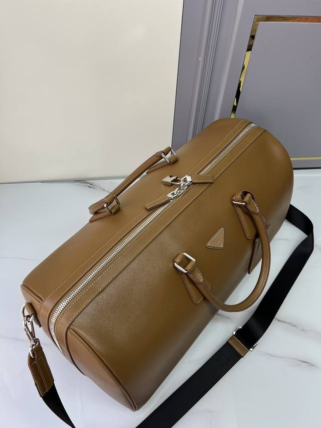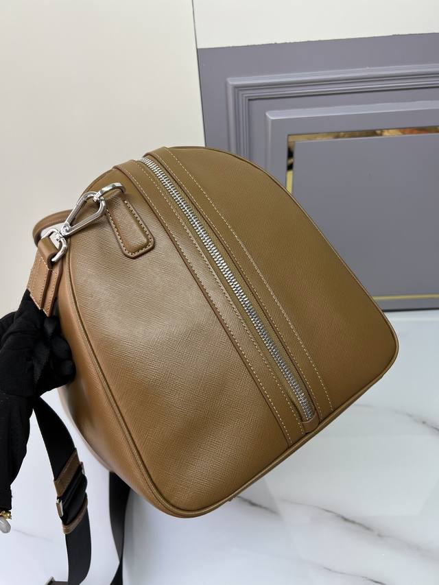 This elegant travel bag is crafted from Saffiano leather and features a wraparound zipper and nylon shoulder strap, showcasing a meticulous design philosophy. It is adorned with a leather nameplate and a metal clasp with an engraved logo, exuding dazzling charm. Simple and sophisticated. Grab yours now!