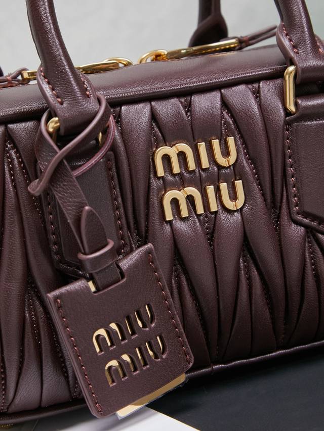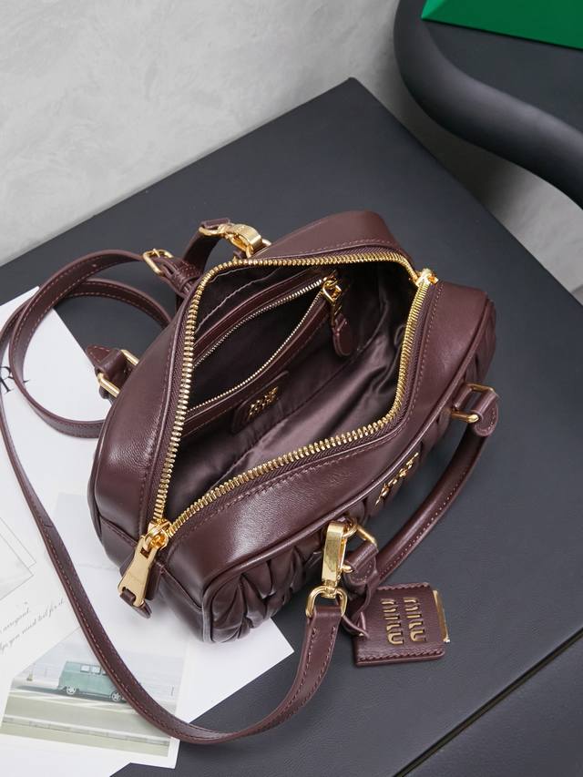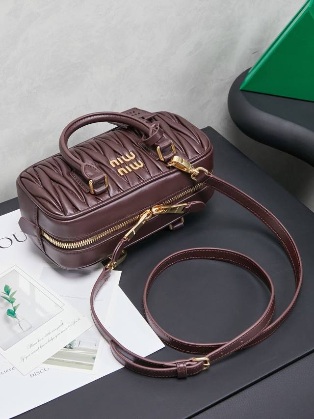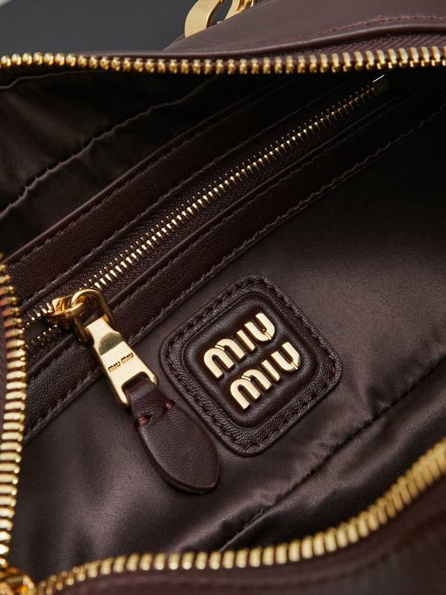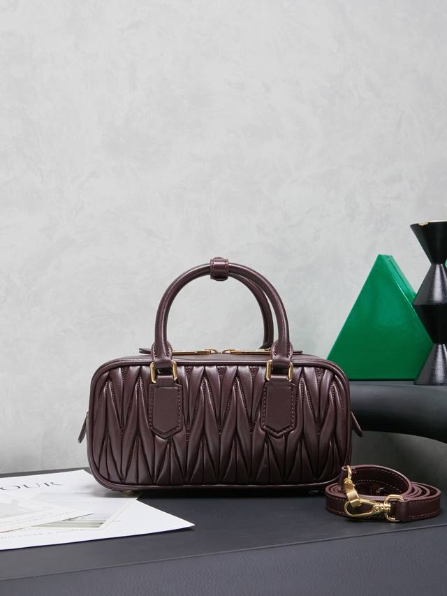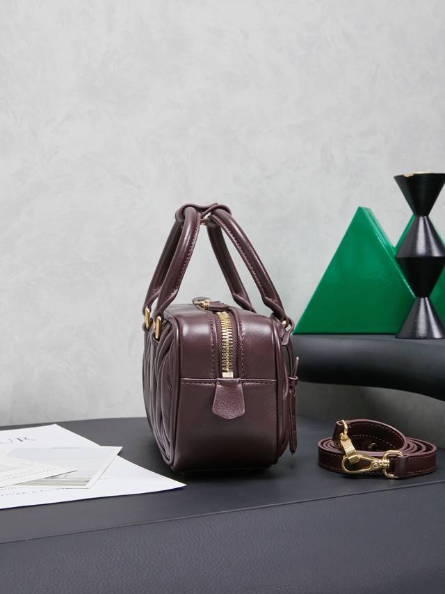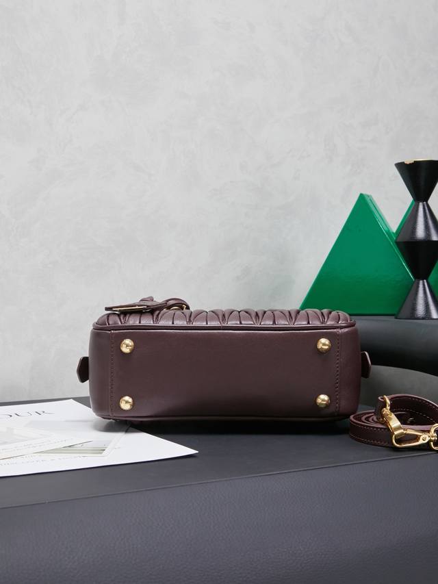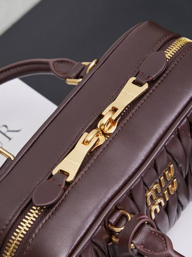 New version: 5Bb142, Miu's new bowling bag, featured on the official website, featuring the latest white-edged color matching, top-grade imported lambskin, and Miu's unique Matelasse pattern. The bag has an exquisite three-dimensional shape, with a front engraved logo that matches the color of the leather. It has a detachable and adjustable long leather shoulder strap, a cotton satin lining, and a zippered pocket. This bag is also worn by many celebrities and influencers. Dimensions: 22x10.5x7.5cm