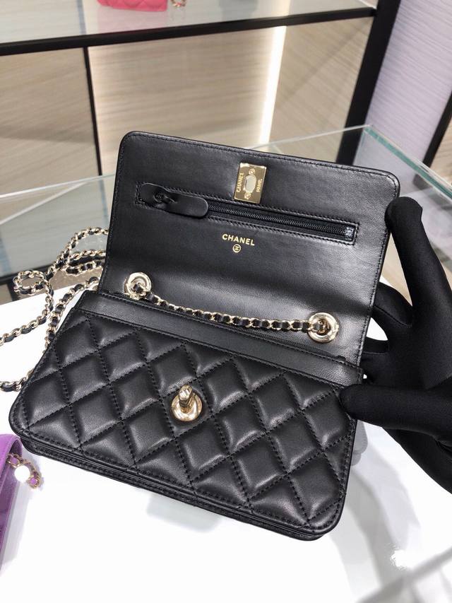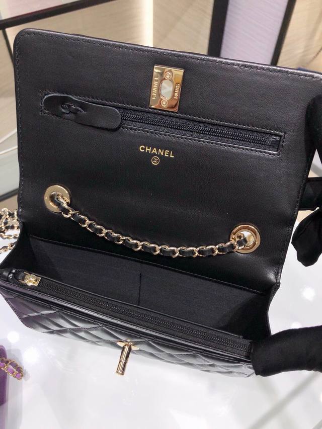 . Metal plaque rotating buckle clasp. Inside one zipper pocket and six card slots. Size 19cm. A84456Y Ohanel Trendy Woc chain bag in lambskin. Flap closure