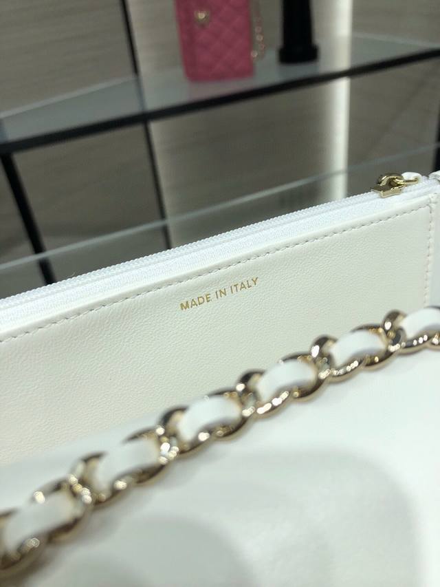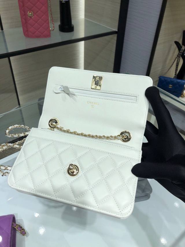 . Metal plaque rotating buckle clasp. Inside one zipper pocket and six card slots. Size 19cm. A84456Y Ohanel Trendy Woc chain bag in lambskin. Flap closure