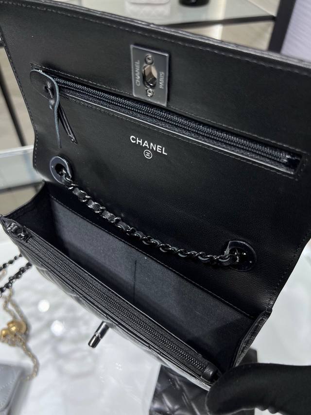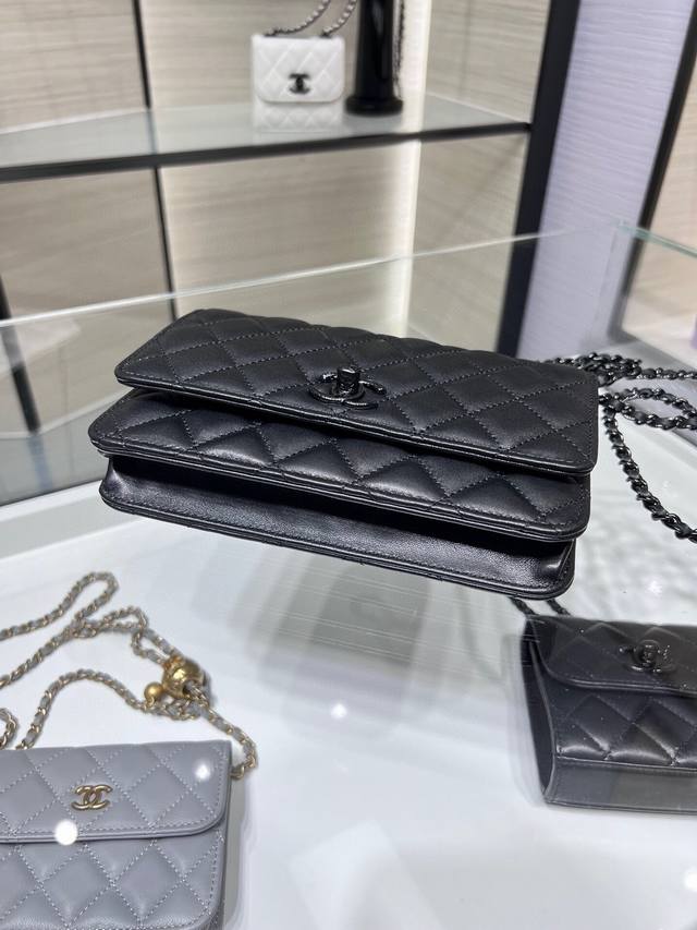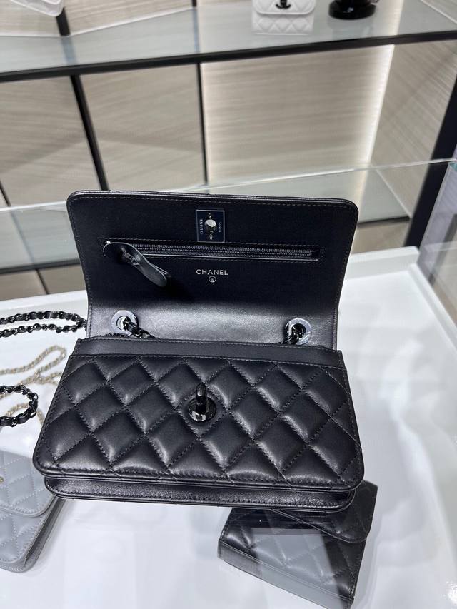 metal plate rotating buckle with a built-in zipper pocket and six card slots. Size 19cm. A84456Y Ohanel 22B new panda color Woc chain bag, lambskin flap closure