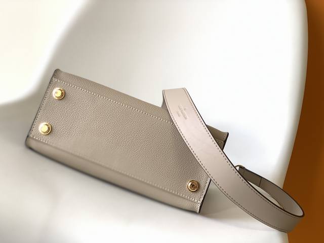 On My Side Small Handbag M57728 Black M57729 Tan This On My Side small handbag combines supple calfskin with classic Monogram canvas side linings. A detachable wide shoulder strap allows for shoulder or crossbody wear, while a top handle adds the option of hand-carrying or elbow-carrying. A large exterior pocket makes it easy to access your belongings. 25.0 X 20.0 X 12.0 cm (Length X Height X Width)
