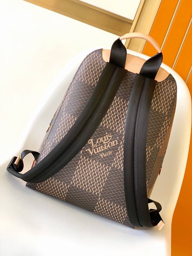 Original all-leather backpack with exclusive real-shot background image, style number N40380 Campus. This backpack is from the capsule collection collaboration between Virgil Abloh and Japanese streetwear master Nigo. It features Giant Damier Ebene coated canvas with natural leather trim and metal hardware, while Monogram canvas depicts Nigo's signature wave pattern on the front pocket. Dimensions: 30.0 x 39.0 x 13.0 cm.
