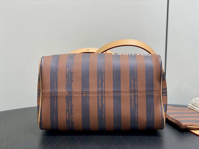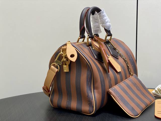 Original boutique M14064 coffee striped full leather Speedy pillow bag. Speedy P