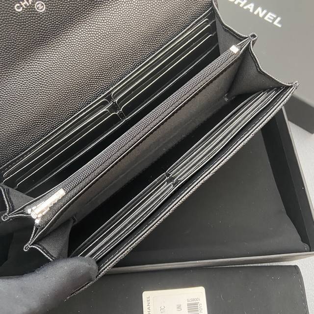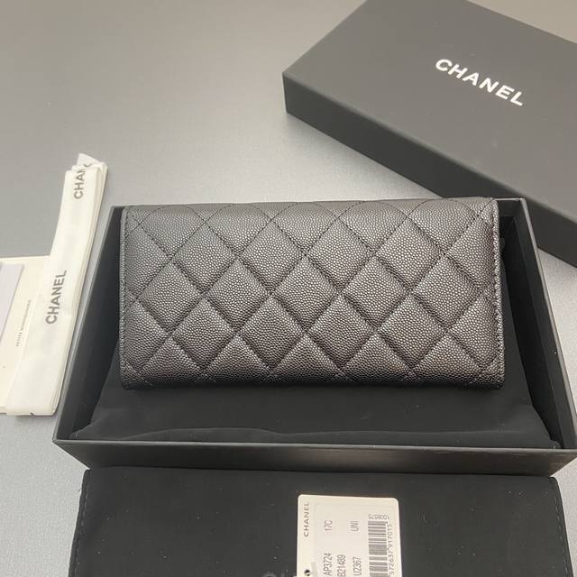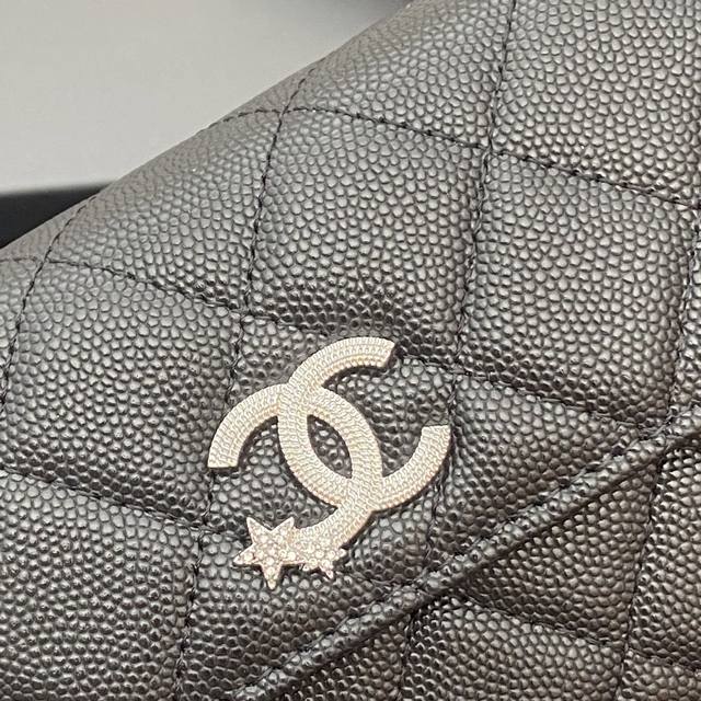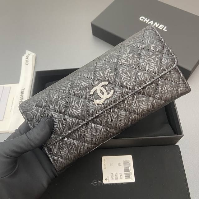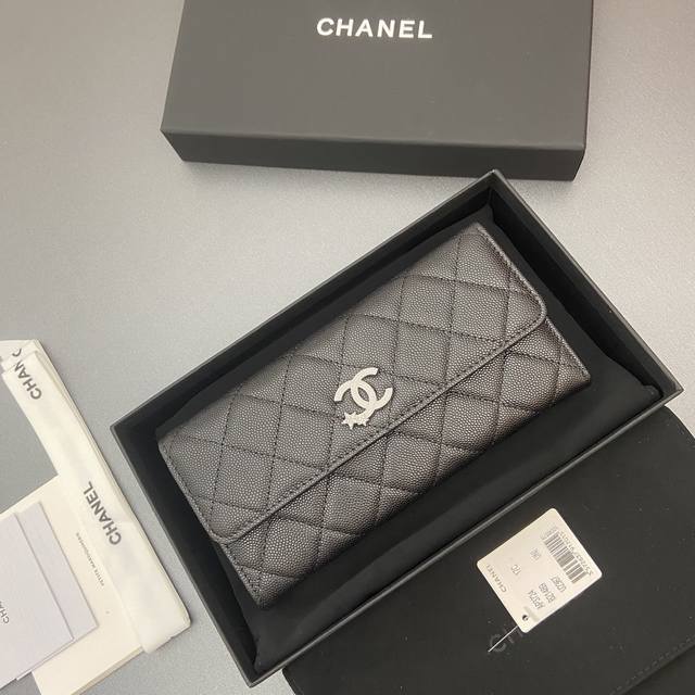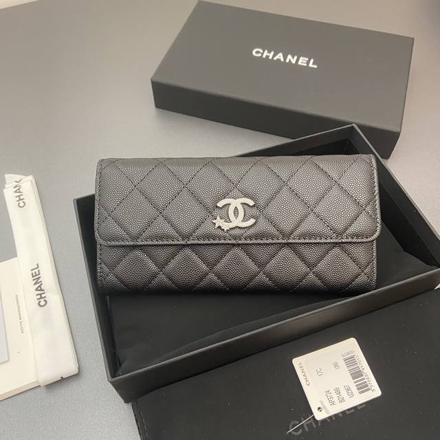Original Leather 25B New Series Caviar Leather with Star Logo, Sparkling Blingblibg~ Flap Long Wallet Series Black with Fine Ball Texture and Silver Star Hardware 12 Card Slots, Two Bill Compartments Two Compartments, 1 Zippered Pocket Item Number: 3724 Dimensions: W19