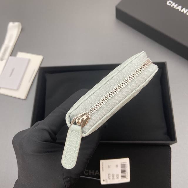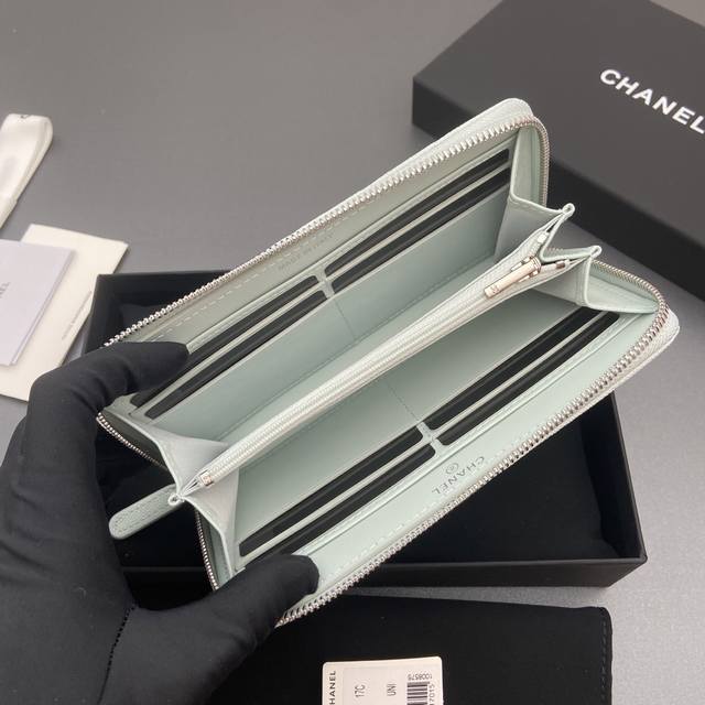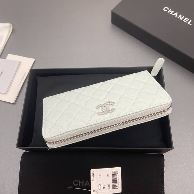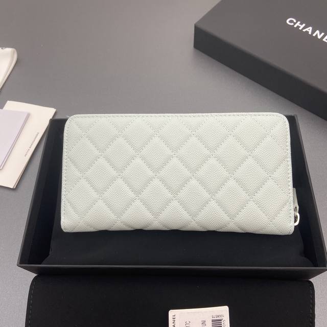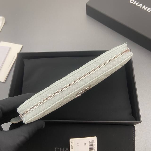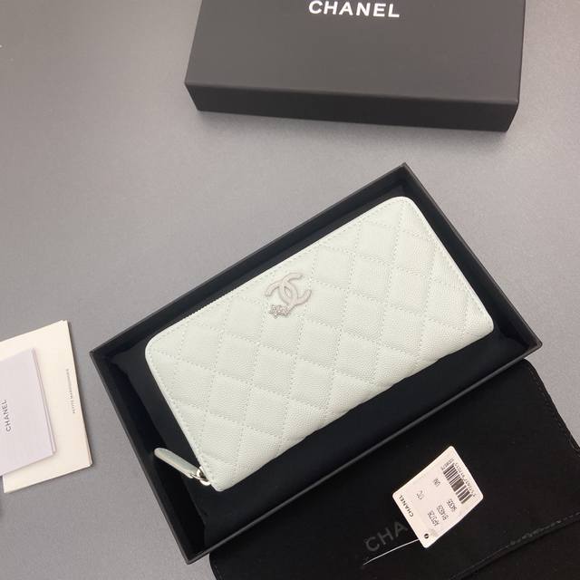 Original Leather Bag, 25B New Series Caviar Leather with Star Logo, Sparkling Blingblibg~ Zipper Bag Series, Light Blue with Fine Gooey Texture and Silver Star Hardware, 12 Card Slots, Two Bill Compartments, Two Compartments, 1 Zipper Pouch. Item Number: 3726. Dimensions: W19