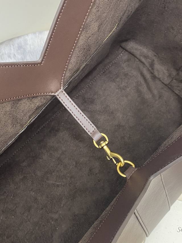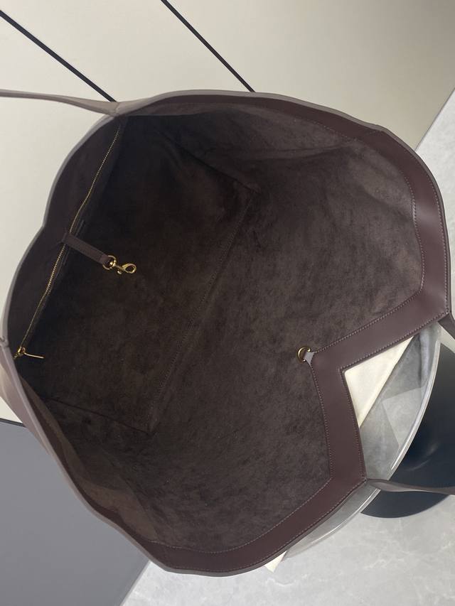 Original Leather DDD Dark Coffee Plain Antique Gold DDD New Y Brand Fine Grain Leather Tote Bag! Tonal suede full lining design~ Adorned with a beautiful Y logo inspired by the brand's historical archives_Lightweight and spacious shopping bag! Features an internal zip pocket and hook closure, suede lining, bronze metal hardware, hook closure, an internal zip pocket, and a minimalist Y logo