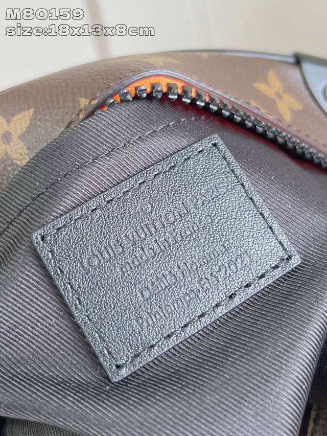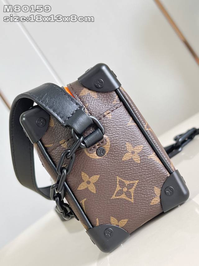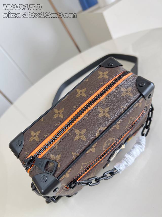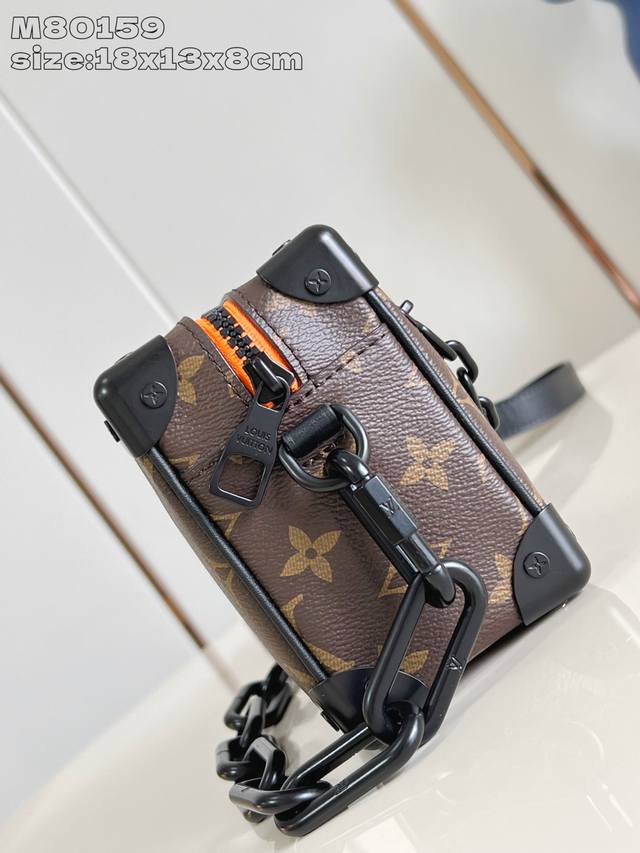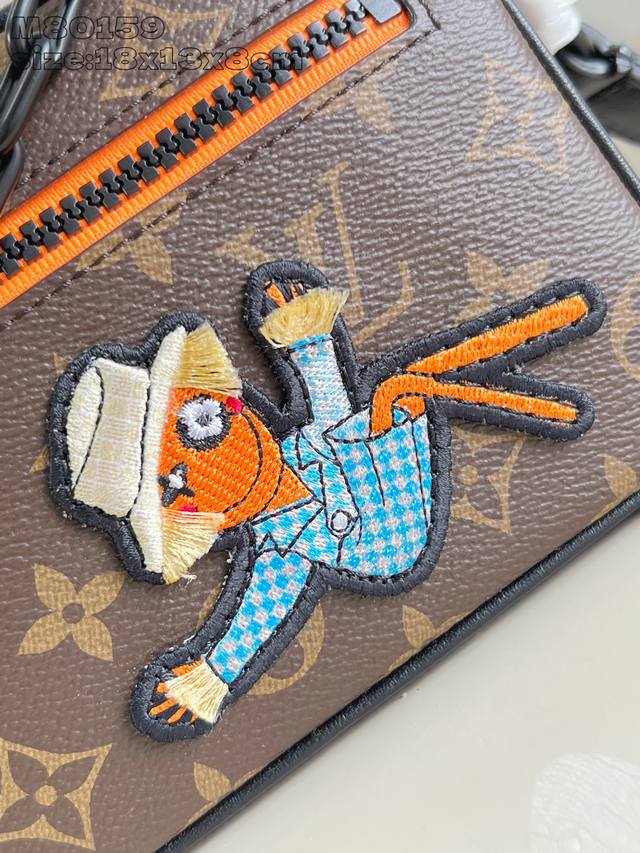 Exclusive photos of the M80159 Mini Soft Trunk chain bag, crafted from Monogram canvas with matte leather trim. Embroidered patches depict the Zoooom With Friends animated characters created by Virgil Abloh for his Spring/Summer fashion show. Zippers on the top and front pockets add a touch of vibrant color. Dimensions: 18.5