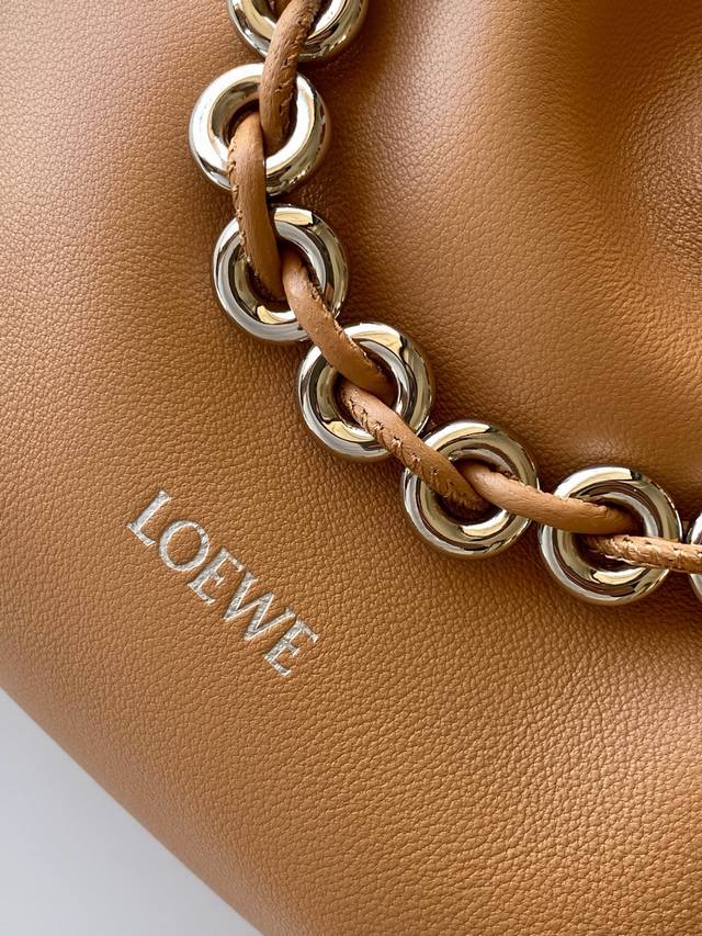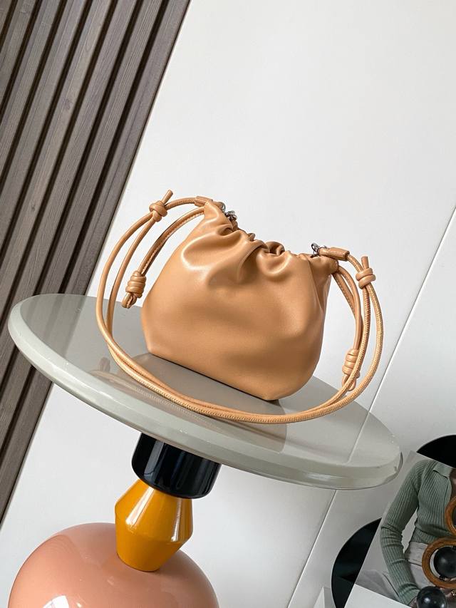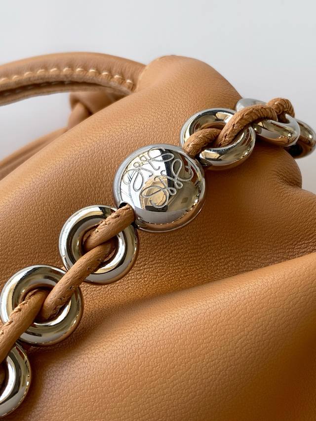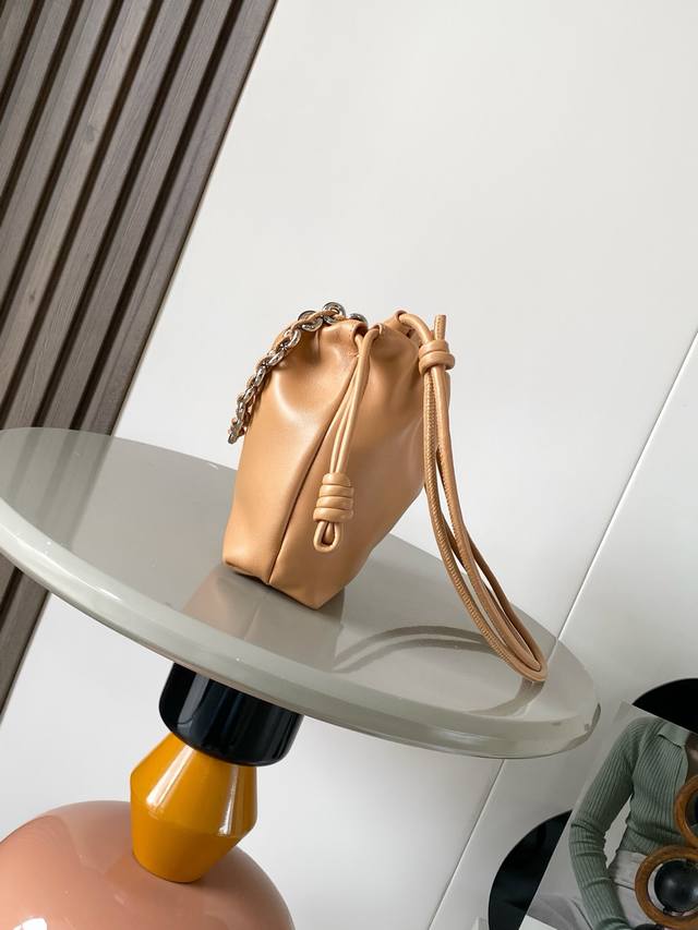 Original Leather Flamenco Purse Mini Nappa Leather Clutch Bag (Celebrity Style) The Flamenco Purse handbag features a pleated design with key details such as the iconic rope knot on the side. Stylish and versatile, it can be carried as a clutch, shoulder bag with the donut chain strap, or crossbody bag with the leather shoulder strap. This version is crafted from supple Nappa leather. * Can be carried on the shoulder, crossbody, or by hand * Detachable and adjustable leather shoulder strap * Detachable donut chain with Anagram engraved pebble pattern * Discreet magnetic closure * Suede lining * L0Ewe gold or silver foil stamping Style Number: 9058 Size: 23cm