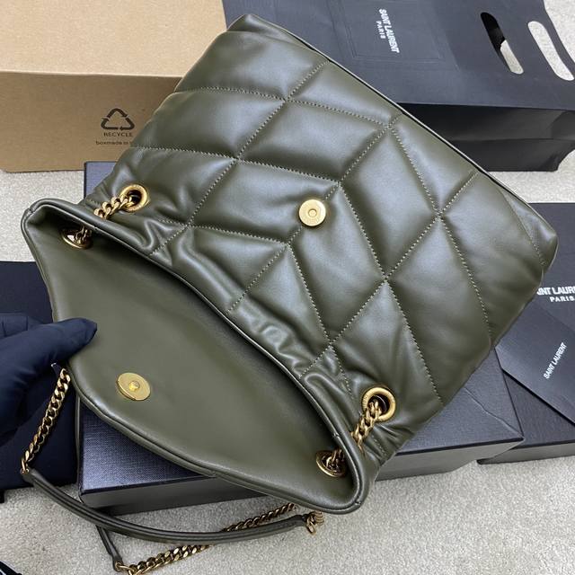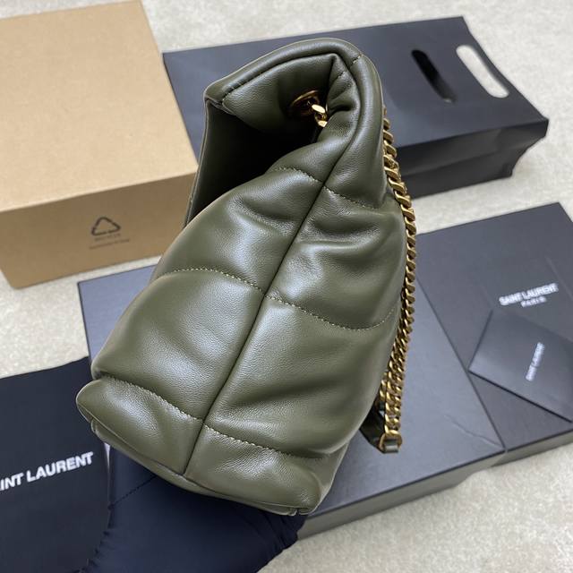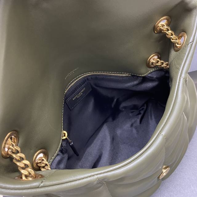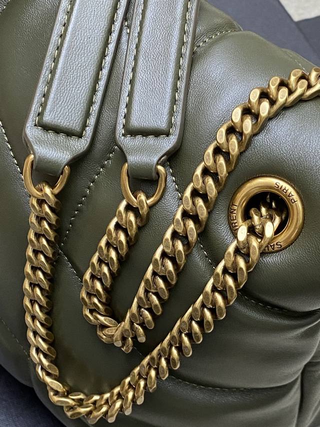 Original Leather Green Lambskin Antique Hardware Loulou Puffer Medium Quilted Lambskin Bag. Made of original genuine leather, soft and delicate to the touch, like holding a cloud. The classic Y brand logo, chain, and buckle hardware are all made of Bulgari matte antique gold hardware. The bag opening uses a magnetic snap closure after folding, providing excellent sealing and security. Model: 577476 Original Leather Size: 29X17X11Cm