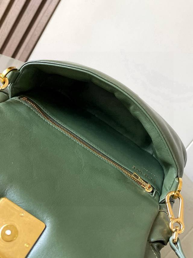 Original Leather DDD Mini Glossy Nappa Lamb Leather Pleated Puffer Goya Handbag. Inspired by the Goya aesthetic, the Goya Puffer brings a new sensory and tactile dimension through its shiny Nappa lamb leather with goose feather lining. This mini version is crafted from pleated lamb leather, hand-cut, stitched, and sewed. * Multiple carrying options: shoulder or hand carry * Detachable and adjustable shoulder strap * Magnetic snap closure * One compartment and one zip pocket * Nappa lamb leather lining DDD Dimensions: 20cm