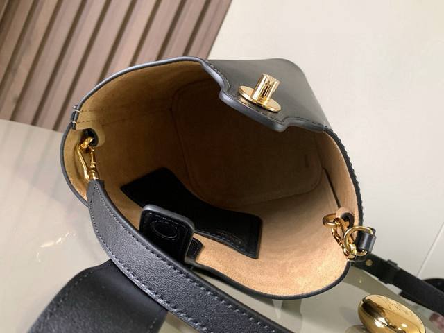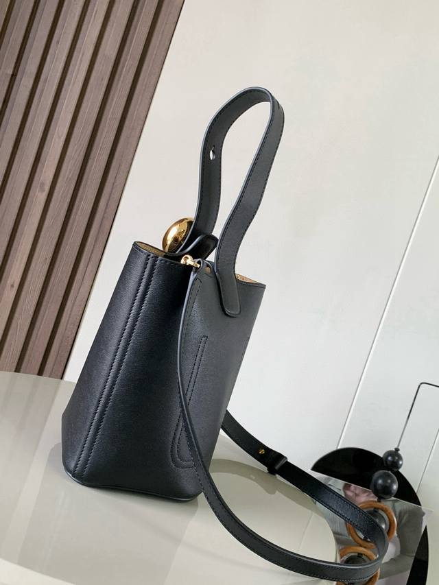 Mini soft grained cow leather pebble Bucket The pebble bucket handbag cleverly combines pure simple lines with eye-catching design style to create a unique and innovative handbag design. The iconic Anagram engraved hardware combines decorative and practical functions, with adjustable shoulder strap length and suitable for a variety of carrying methods. The unique twisted structure complements the subtle details. This mini version is made of soft grained cow leather. Can be carried crossbody, on the shoulder or by hand * Adjustable and detachable shoulder strap * Magnetic buckle closure * Inner pocket * Synthetic leather lining *