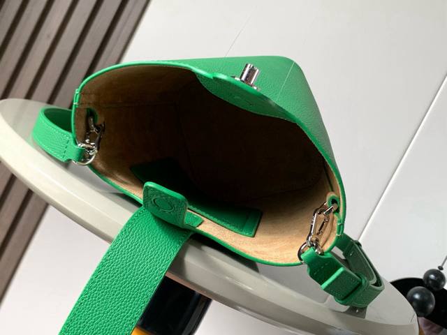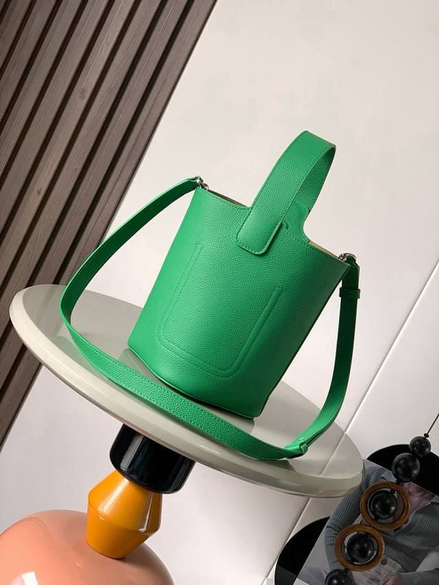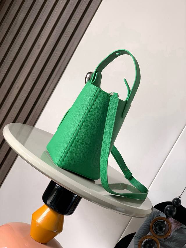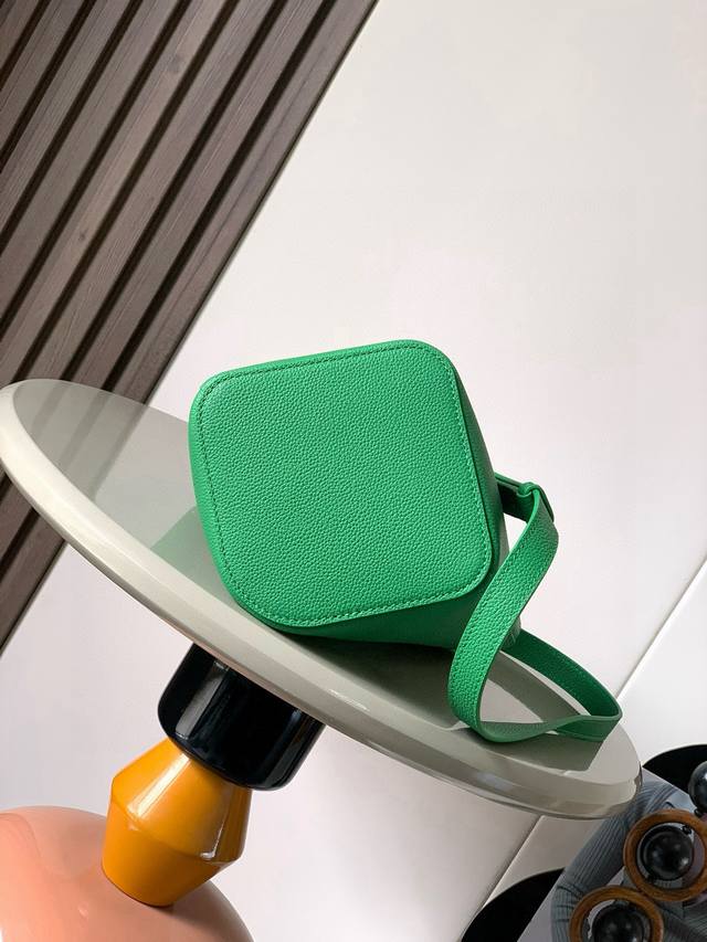 Mini soft grained cowhide leather pebble bucket bag. The pebble handbag cleverly combines pure minimalist lines with eye-catching design style to create a unique and innovative handbag design. The iconic Anagram engraved hardware combines decorative and practical functions, with adjustable shoulder strap length and suitable for various carrying methods. The unique twisted structure complements the subtle details. This mini version is made of soft grained cowhide. Can be carried crossbody, on the shoulder or by hand. * Adjustable and detachable shoulder strap * Magnetic buckle closure * Inner pocket * Synthetic leather lining *