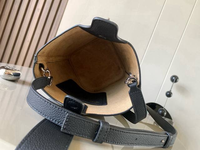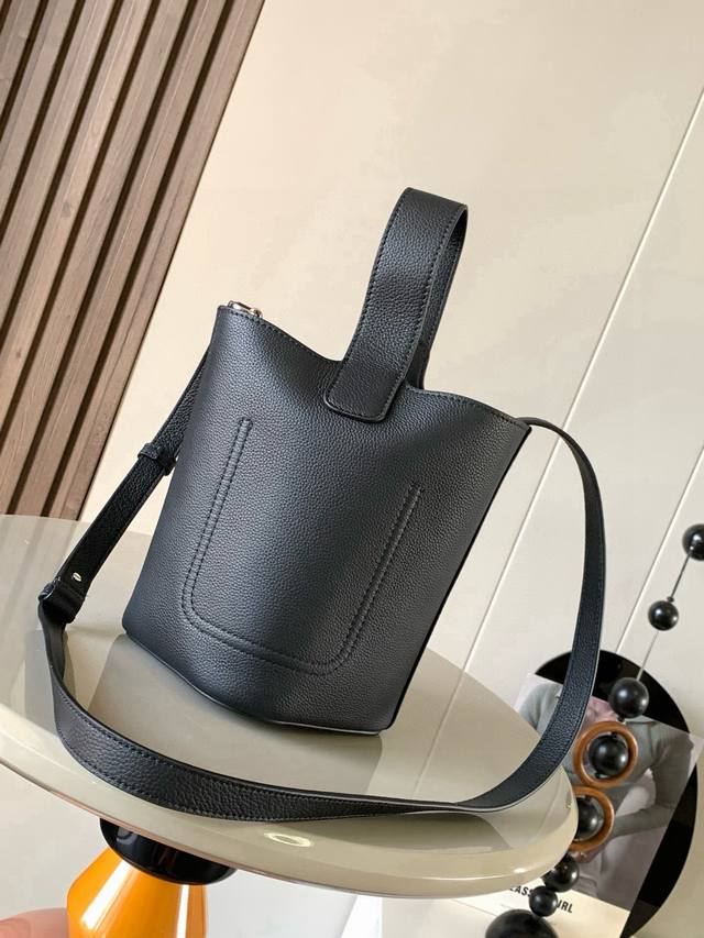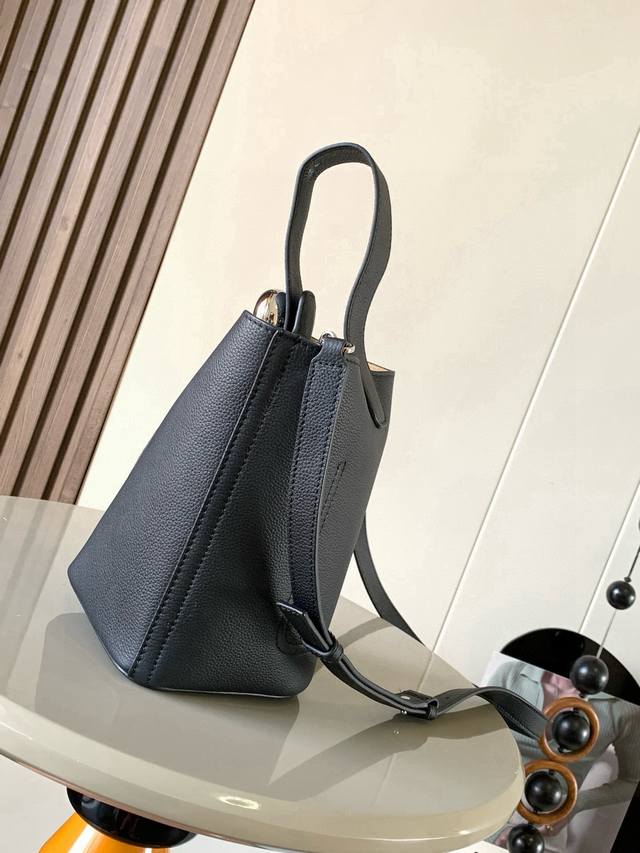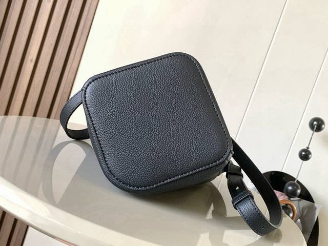 Original Leather Ddd Mini Soft Grained Cowhide Pebble Bucket Bag. The Pebble bag cleverly blends pure, minimalist lines with a striking design style to create a unique and innovative handbag design. The iconic Anagram engraved hardware combines decoration and practicality, the adjustable shoulder strap is suitable for multiple carrying methods, and the unique twisted structure and subtle details complement each other perfectly. This mini version is made of soft grained cowhide leather. Can be worn crossbody, over the shoulder, or carried by hand. *Adjustable and detachable shoulder strap *Magnetic snap closure *Interior pocket *Synthetic leather lining* Ddd Anagram Engraved Pebble Ddd Style No.: 9047 Ddd Color: Black Ddd Size: 20cm