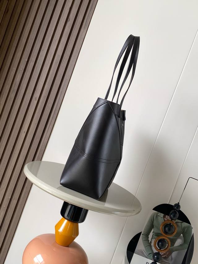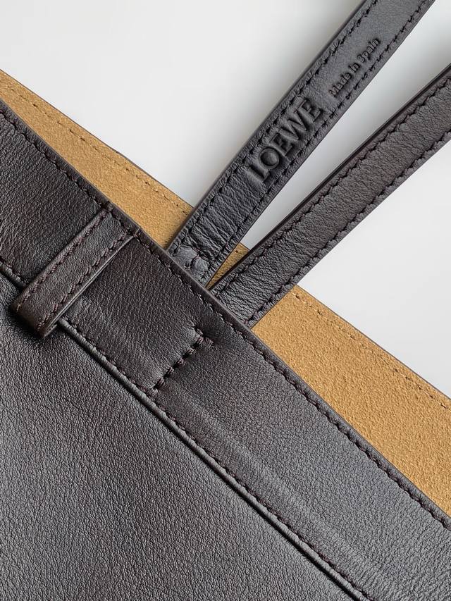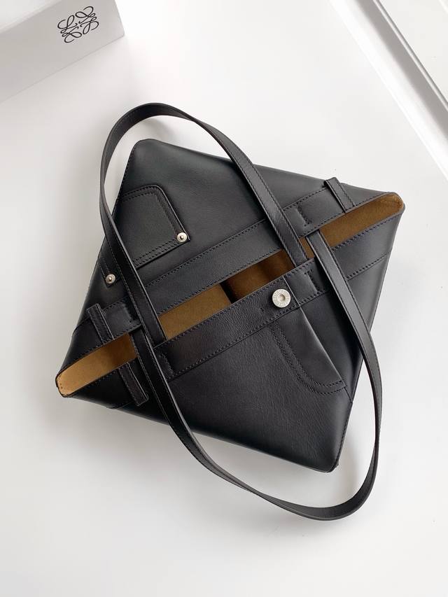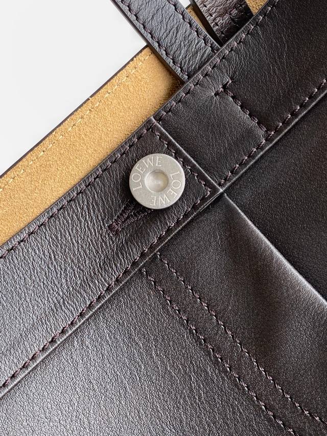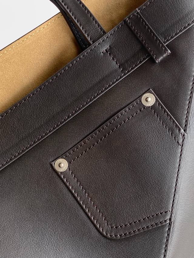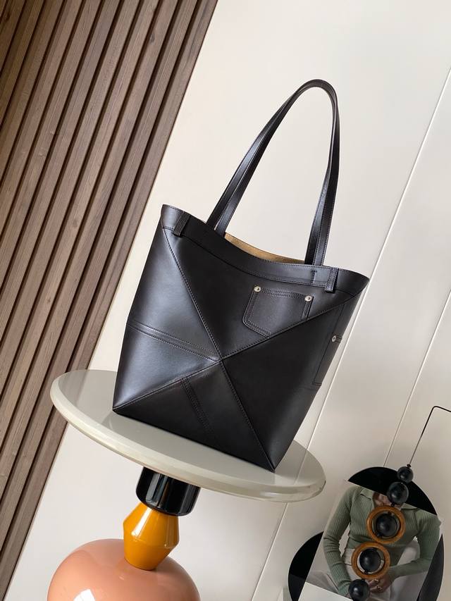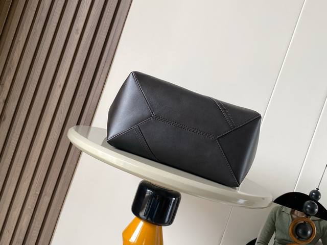 Original Leather Ddd New Medium Glossy Calfskin Puzzle Fold Panta Handbag. The Puzzle Fold features a lightweight geometric design that folds completely flat, making it a great travel companion. This medium version is crafted from vintage-finish glossy calfskin with denim trouser-style details. *Can be carried on the shoulder or by hand. *Suede lining with "LOEwe" hot stamping. Ddd Dimensions: 31.5cm