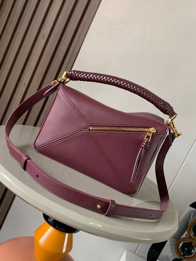 Original Leather Ddd New Small Soft Calfskin Puzzle Handbag. This is the first handbag designed by Creative Director Jonathan Anderson. The rectangular shape and precise cutting techniques create the unique geometric lines of the Puzzle. This small version is made of soft calfskin and features a unique woven handle. * This small Puzzle handbag can hold, for example, a large wallet, all-size phones, and sunglasses. Can be worn over the shoulder, crossbody, carried by hand, or held in the hand. Detachable and adjustable shoulder strap. * Zipper closure, calfskin zipper pull, external zippered back pocket, and one internal slip pocket. * Customization is available with shoulder straps and personalized charms. * Suede lining. * Anagram embossing. Ddd Size: 24cm