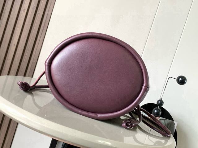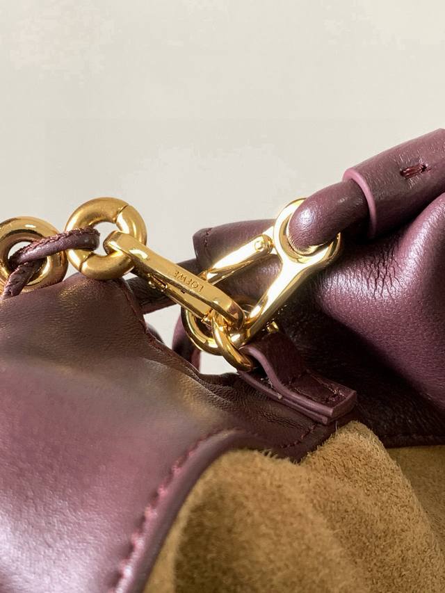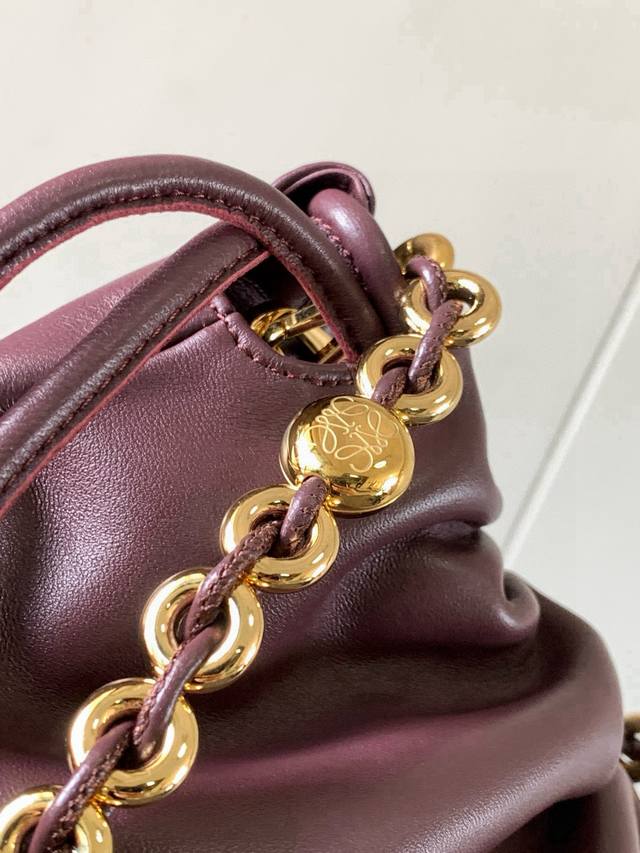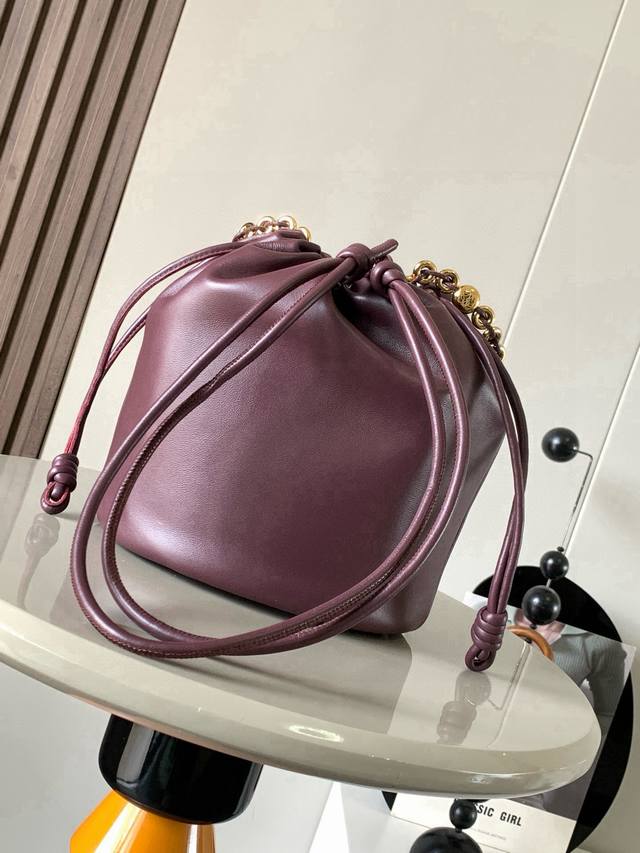 New soft nappa leather Flamenco Purse Bucket Bag. The new Flamenco Purse features a pleated design and key details such as the signature knot on the side. The Bucket Bag is now available in a new size perfect for everyday use while maintaining the collection's feminine style. This stylish and versatile style can be worn with the donut chain or cross-body with the leather strap. This version is crafted from soft nappa leather. *Can be worn on the shoulder, cross-body, or by hand *Detachable and adjustable leather strap *Detachable donut chain with Anagram engraved pebble pattern *Unobtrusive magnetic closure *Suede lining *LO Ewe gold or silver hot stamping