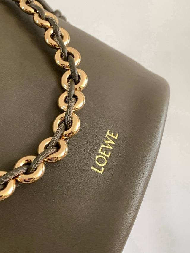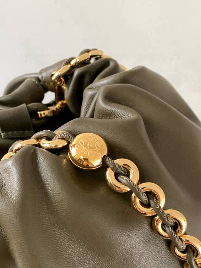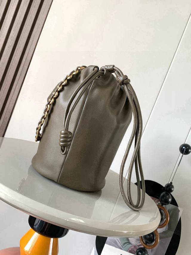 New soft nappa leather Flamenco Purse Bucket Bag. The new Flamenco Purse bag features a pleated design and key details such as the signature knot on the side. The Bucket Bag is now available in a new size perfect for everyday use while retaining the collection's feminine style. This stylish and versatile style can be worn on the shoulder with the donut chain or cross-body with the leather shoulder strap. This version is crafted from soft nappa leather. *Can be worn on the shoulder, cross-body, or by hand *Detachable and adjustable leather shoulder strap *Detachable donut chain with Anagram engraved pebble pattern *Unobtrusive magnetic closure *Suede lining *LO Ewe gold or silver hot stamping