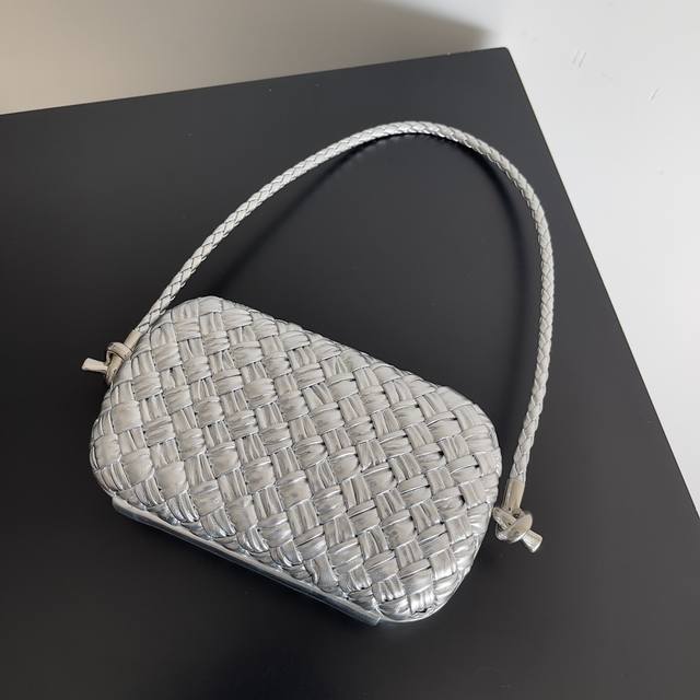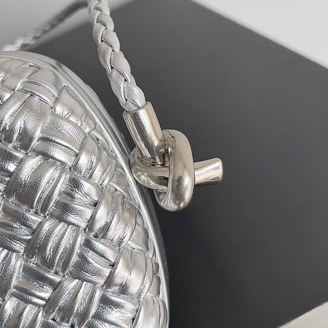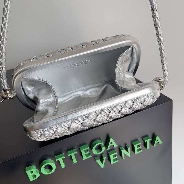Original leather, stainless steel hardware, 24K real gold plating, handmade. Queen Rania and Princess Iman of Jordan wore this Knot clutch to an event. A true Old Money must-have, a statement piece. The classic Knot design is back with a small leather strap for shoulder carrying. A must-have for important occasions, adding charm to your outfit. Style number: 717623. Size: 20.5*6*12.5 mm. Color: Pleated silver.