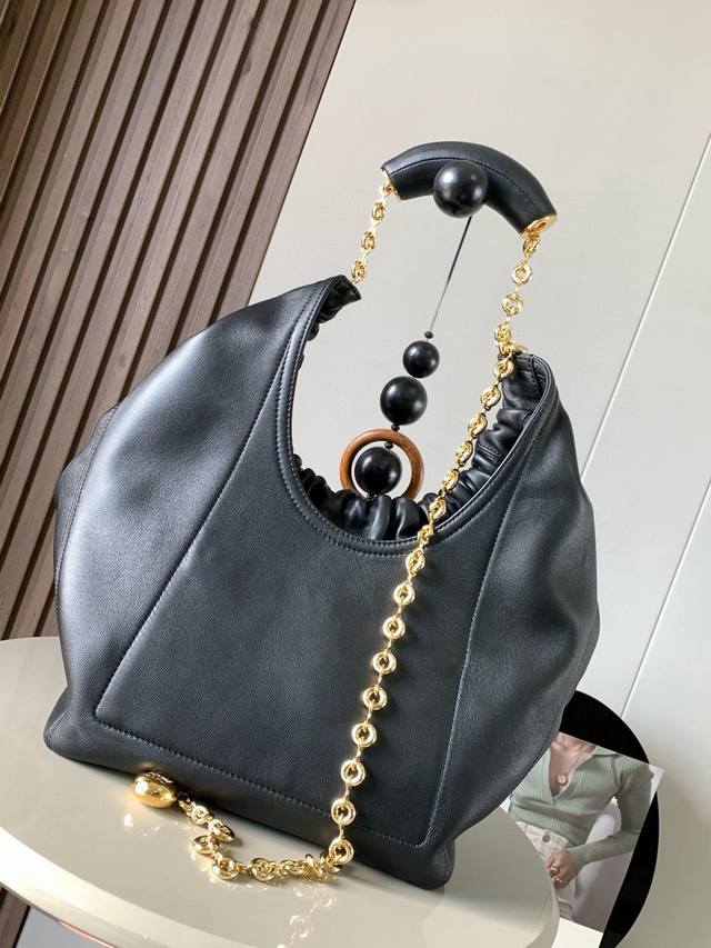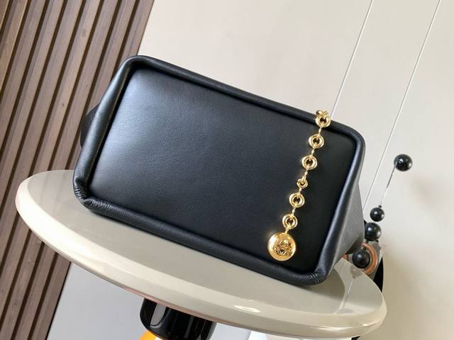 The medium nappa sheepskin Squeeze handbag, the same style as celebrities, is an exquisite and soft new handbag. The newly released Squeeze handbag is made of soft and silky Mellow nappa lambskin. The unlined structure effectively reduces the weight of the bag and looks lighter. The crescent-shaped bag opening is closed with an elegant ruffle, creating a relaxed and casual attitude. Another highlight of this bag is the ergonomic Squeeze airbag handle with an exquisite brass donut chain. The length can be adjusted through the chain link or an extension chain can be added to achieve different carrying methods such as hand, shoulder, and crossbody. The airbag handle can be freely slid into position to improve comfort. An Anagram pebble pendant is embellished at the bottom of the chain, adding smart details to the bag.