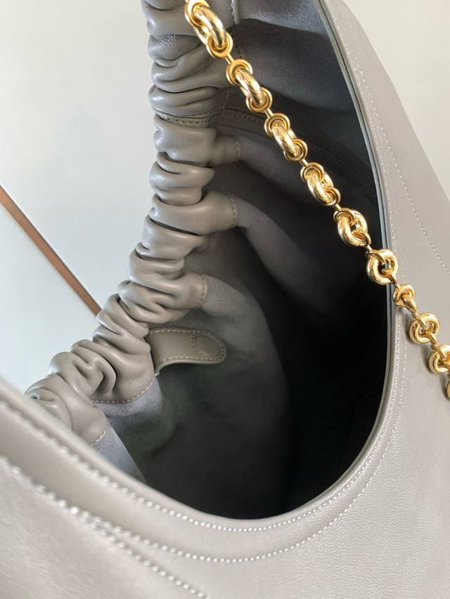 The medium nappa sheepskin Squeeze handbag, the same style as the celebrity, is an exquisite and soft new handbag. The newly released Squeeze handbag is made of soft and silky Mellow nappa lambskin. The unlined structure effectively reduces the weight of the bag and looks lighter. The crescent-shaped bag opening is closed with an elegant ruffle, creating a relaxed and casual attitude. Another highlight of this bag is the ergonomic Squeeze airbag handle with an exquisite brass donut chain. The length can be adjusted by the chain link or an extension chain can be added to achieve different carrying methods such as hand, shoulder, and crossbody. The airbag handle can be freely slid into position to improve comfort. An Anagram pebble pendant is embellished at the bottom of the chain, adding smart details to the bag.