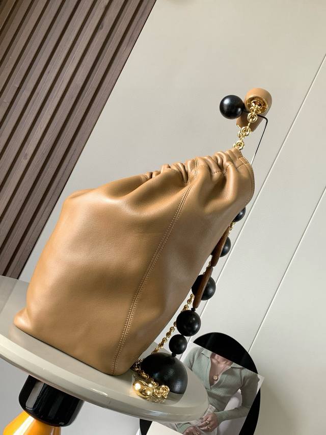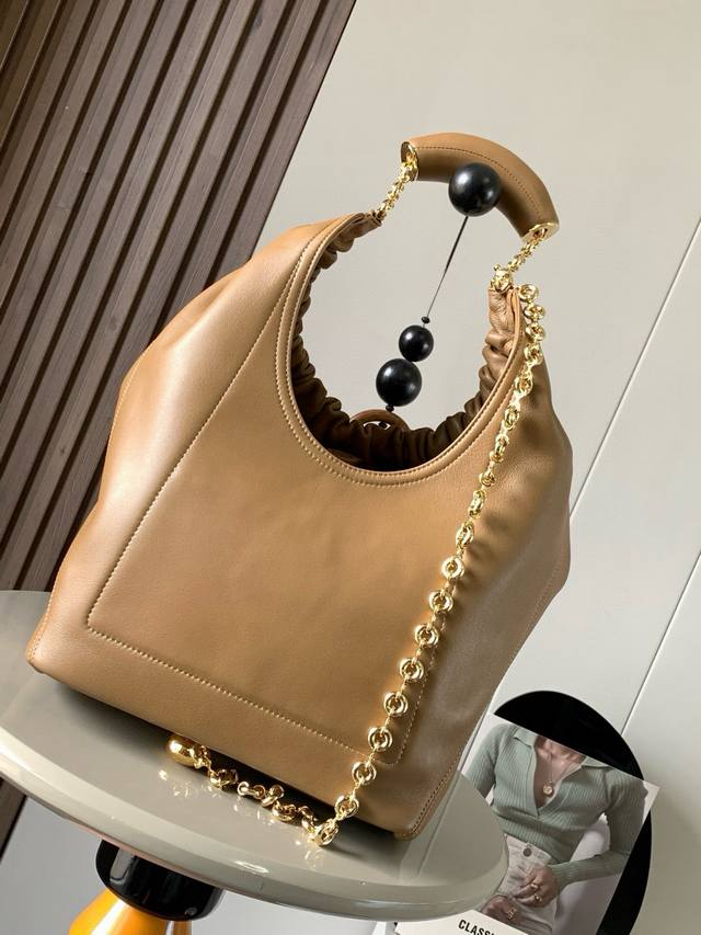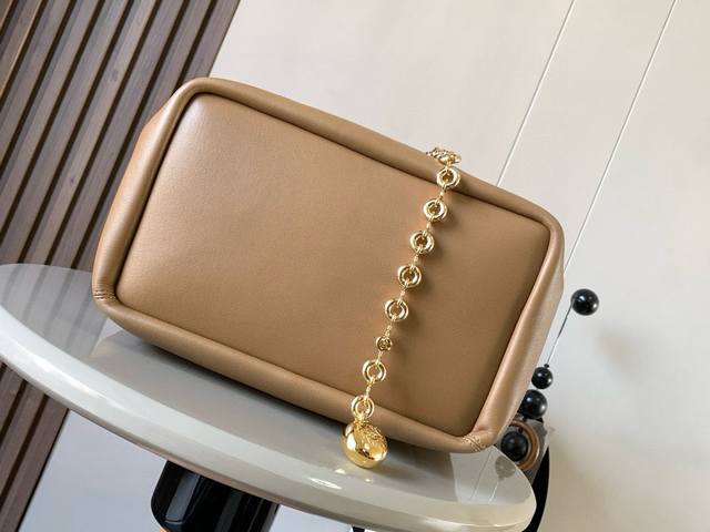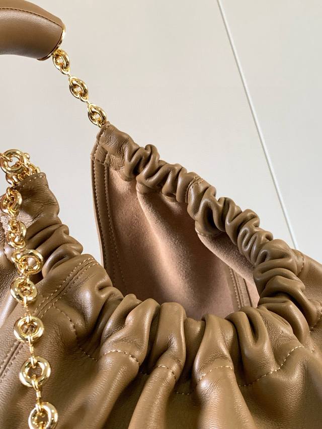 The medium nappa sheepskin Squeeze handbag, the same style as the celebrity, is an exquisite and soft new handbag. The newly released Squeeze handbag is made of soft and silky Mellow nappa lambskin. The unlined structure effectively reduces the weight of the bag and looks lighter. The crescent-shaped bag opening is closed with an elegant ruffle, creating a relaxed and casual attitude. Another highlight of this bag is the ergonomic Squeeze airbag handle with an exquisite brass donut chain. The length can be adjusted through the chain link or an extension chain can be added to achieve different carrying methods such as hand, shoulder, and crossbody. The airbag handle can be freely slid into position to improve comfort. An Anagram pebble pendant is embellished at the bottom of the chain, adding smart details to the bag.