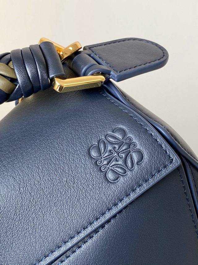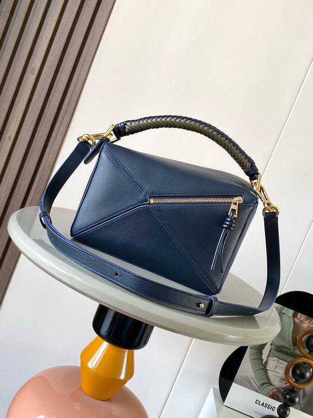 The new small soft calfskin puzzle bag is the first handbag from Creative Director Jonathan Anderson. The rectangular shape and precise cutting techniques create the puzzle's distinctive geometric lines. This small version is crafted from soft calfskin and features a unique woven handle. *This small puzzle bag can accommodate a large wallet, all-sized phones, and sunglasses. It can be carried on the shoulder, crossbody, in the hand, or in the hand. Removable and adjustable shoulder strap. *Zip closure, calfskin zipper pull, exterior zippered back pocket, and interior slip pocket. *Customizable with shoulder strap and personalized charm. *Suede lining. *Anagram embossing.