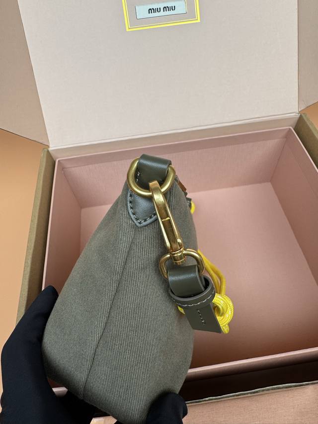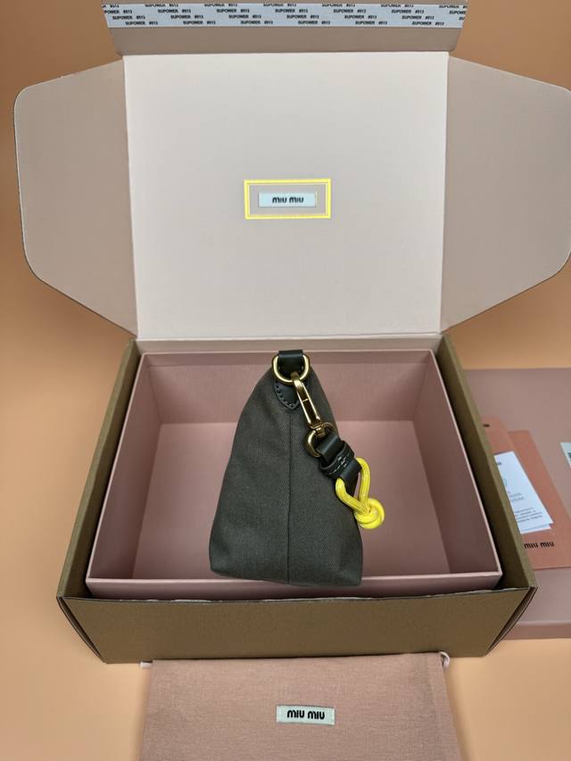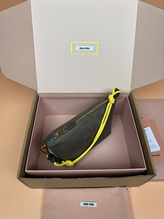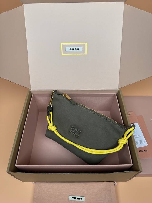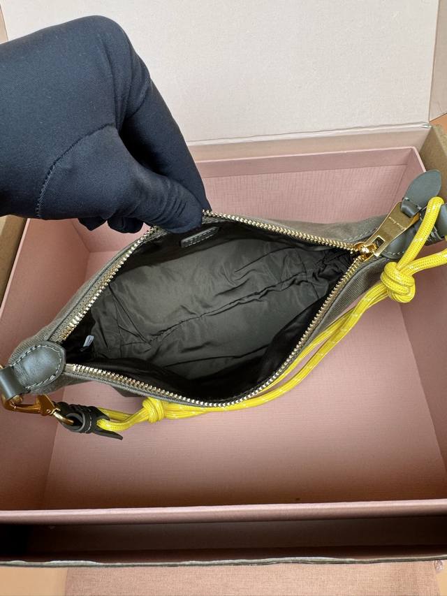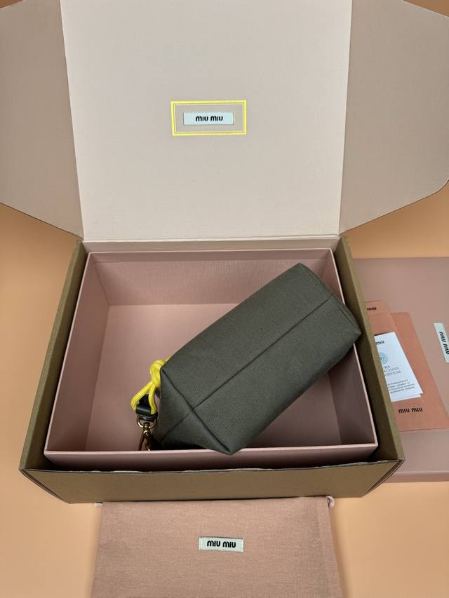 Original leather, with picture packaging. Premium hardware, original leather Nappa gabardine textured small bag - green fabric. This bag features gabardine fabric and a matching embroidered logo, giving it a versatile look. Two-tone woven drawstring strap highlights the brand's authentic style. Features include: zipper closure, hook and loop closure, woven drawstring shoulder strap, lining, embroidered logo. Dimensions: W18.5