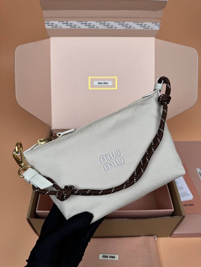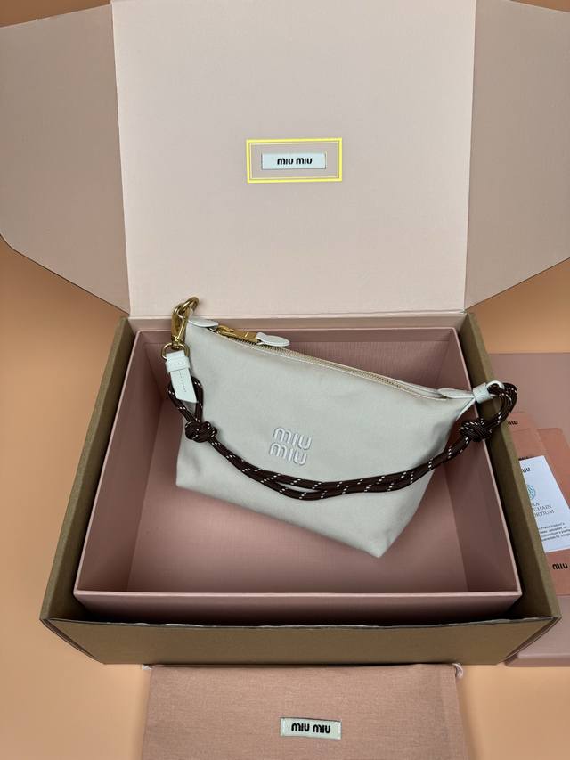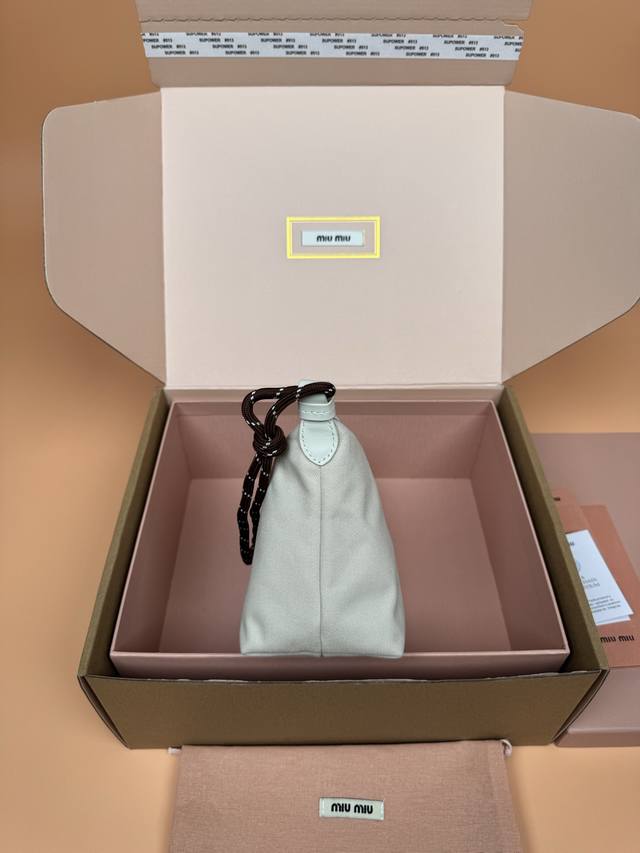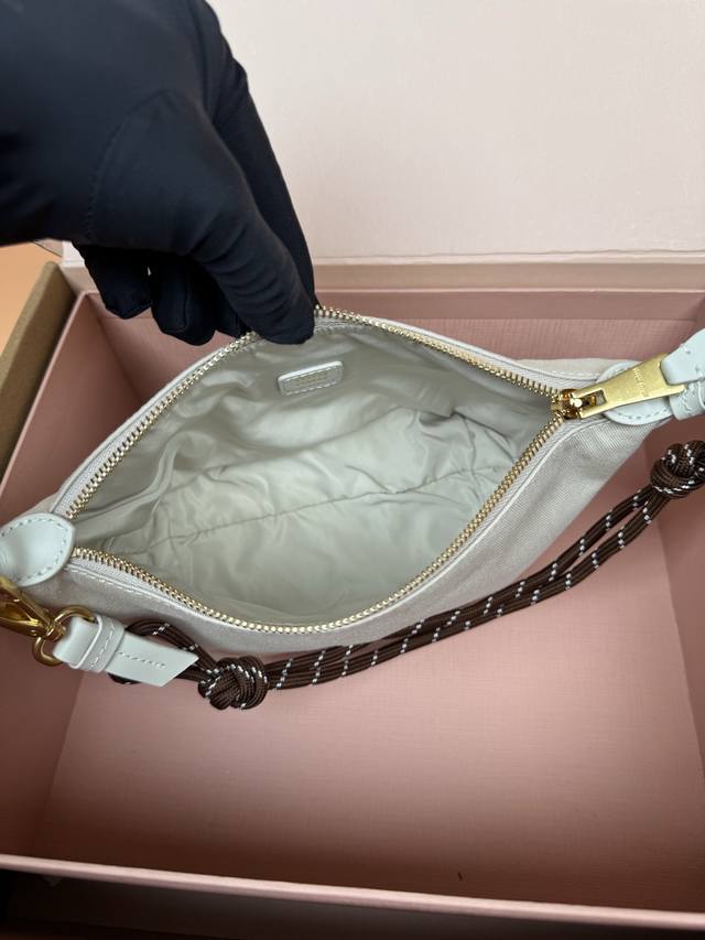 Original leather, with picture packaging. Premium hardware, original leather Nappa gabardine small bag - white cloth. This bag features gabardine fabric and a matching embroidered logo, giving it a versatile look. Two-tone woven drawstring strap highlights the brand's authentic style. Features include: zipper closure, hook and loop closure, woven drawstring shoulder strap, lining, embroidered logo. Dimensions: W18.5