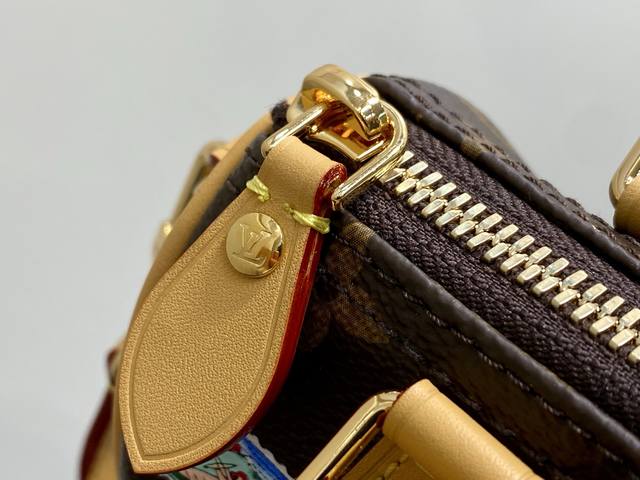 Original Quality M15330 Silkscreen Christmas Mini Speedy Pillow Bag, New Season Nano Speedy Handbag. This Nano Speedy handbag features the brand's mascot, Vivienne, in whimsical illustrations and charms. The iconic Monogram canvas body is paired with leather trim and metal hardware, exuding a lively and stylish feel. 10 x 7.5 x 16 cm (H x W x Length)